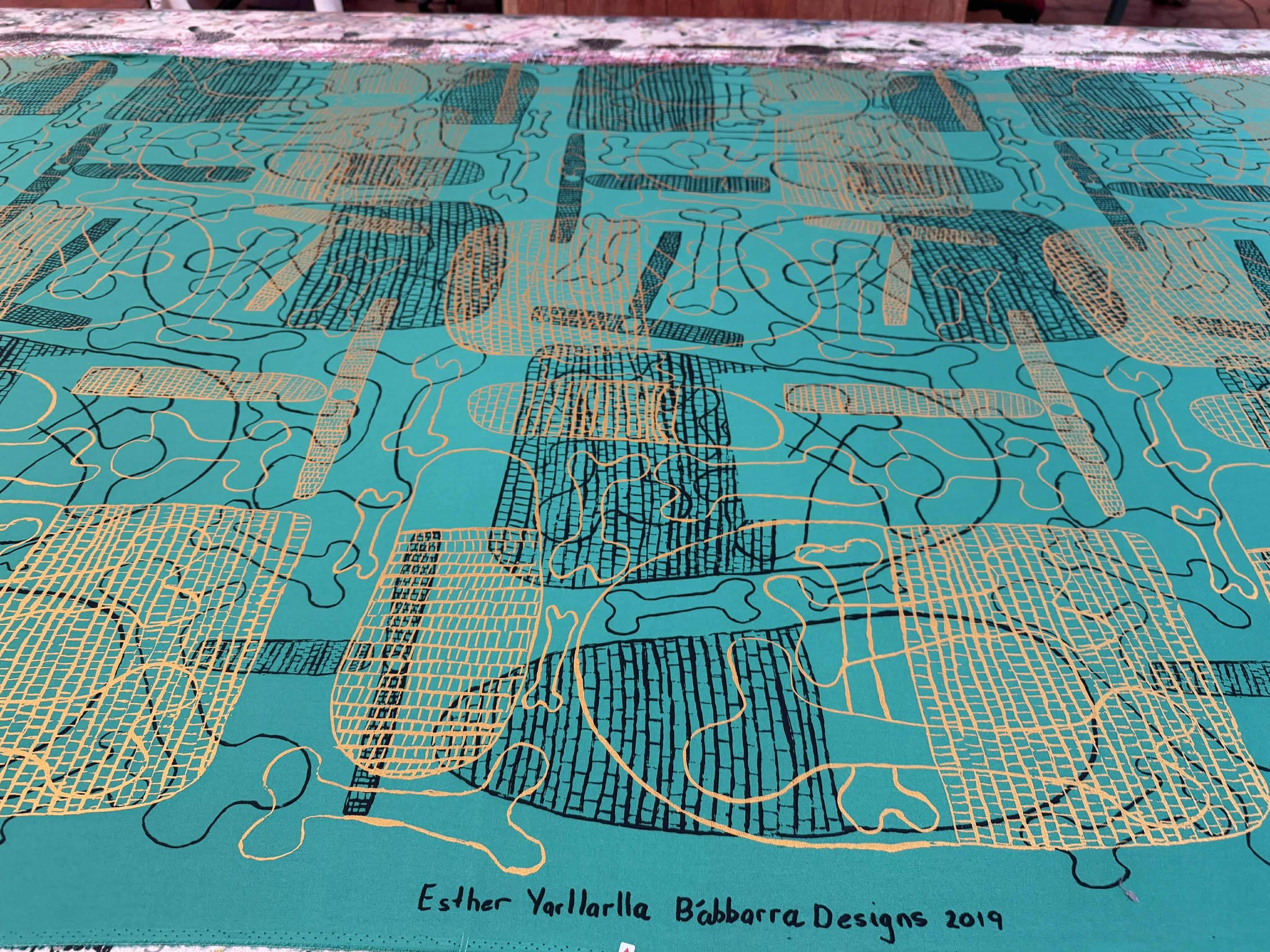 In Esther’s first screen design, she depicts the story of Mardarda (bones) and Njarlarla (fire sticks) carried in a dilly bag, reminiscent of traditional ways of the Ndjebenna people.