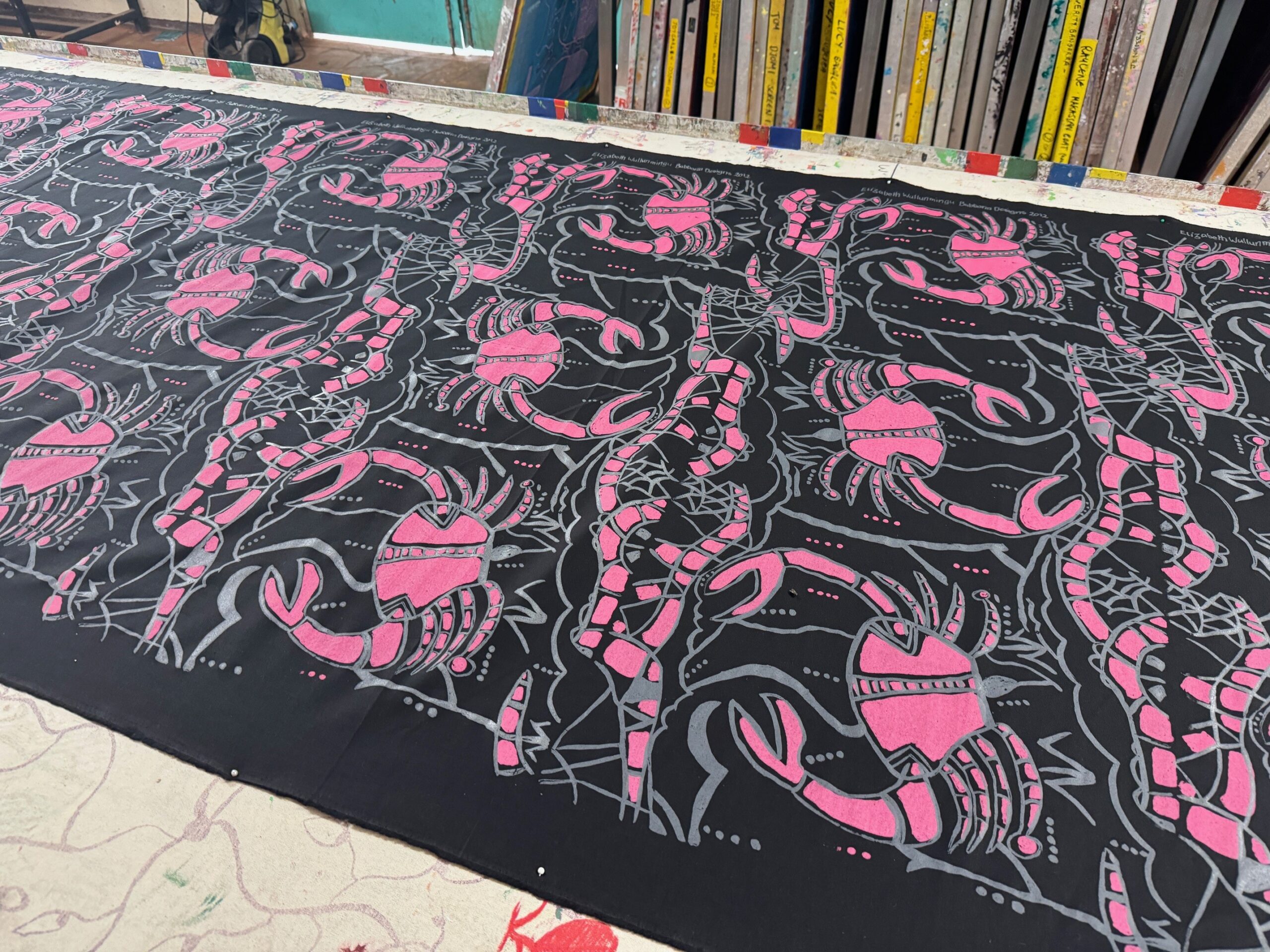 This design tells the story of Elizabeth’s homeland – a dreaming place, a good dreaming place with plenty of Barnkabarra (Mud Crabs). Elizabeth’s homeland lies east of Maningrida, at the mouth of Blyth river. This country is known for a large spiritual mud crab, which lives in the area.