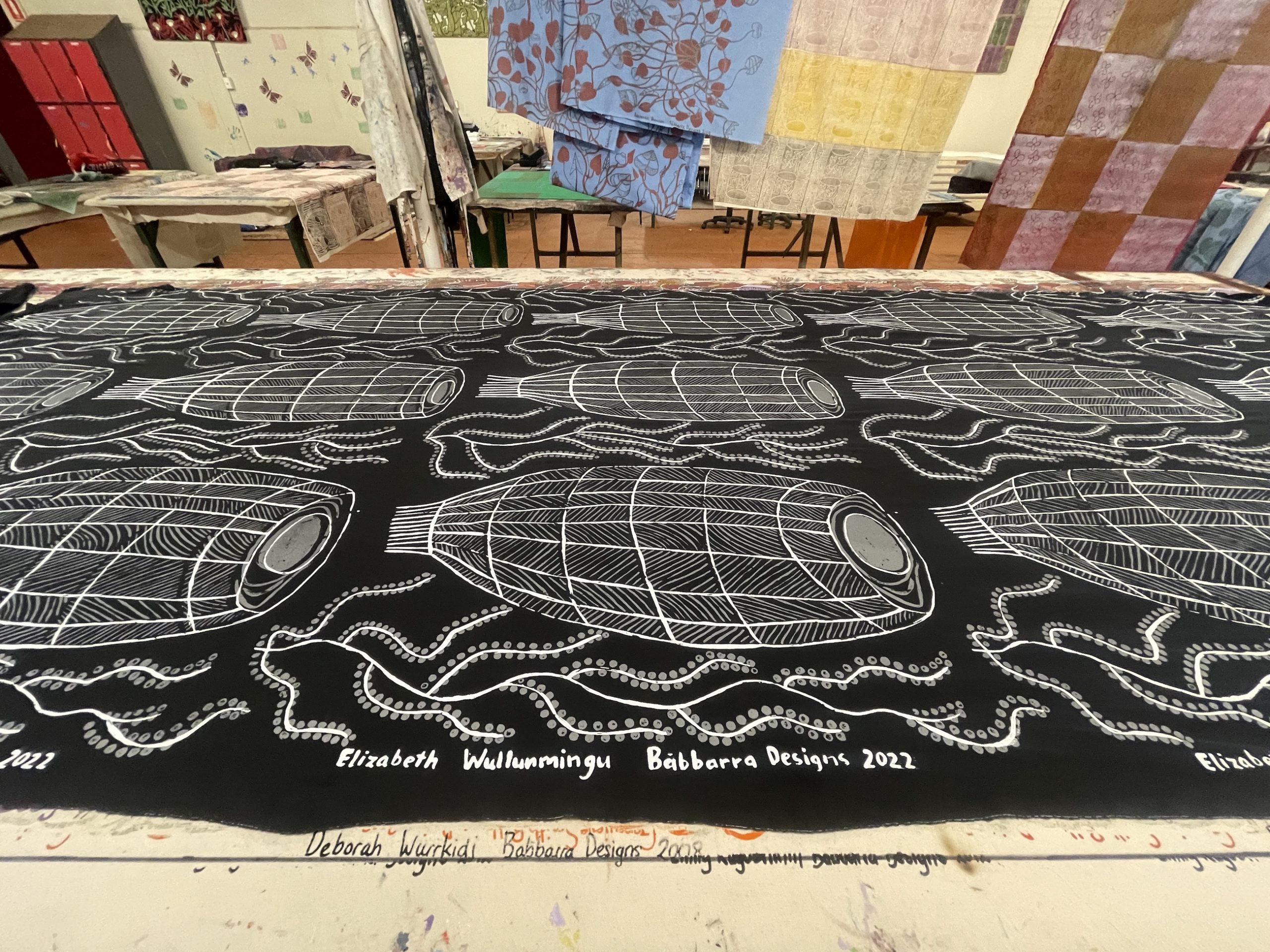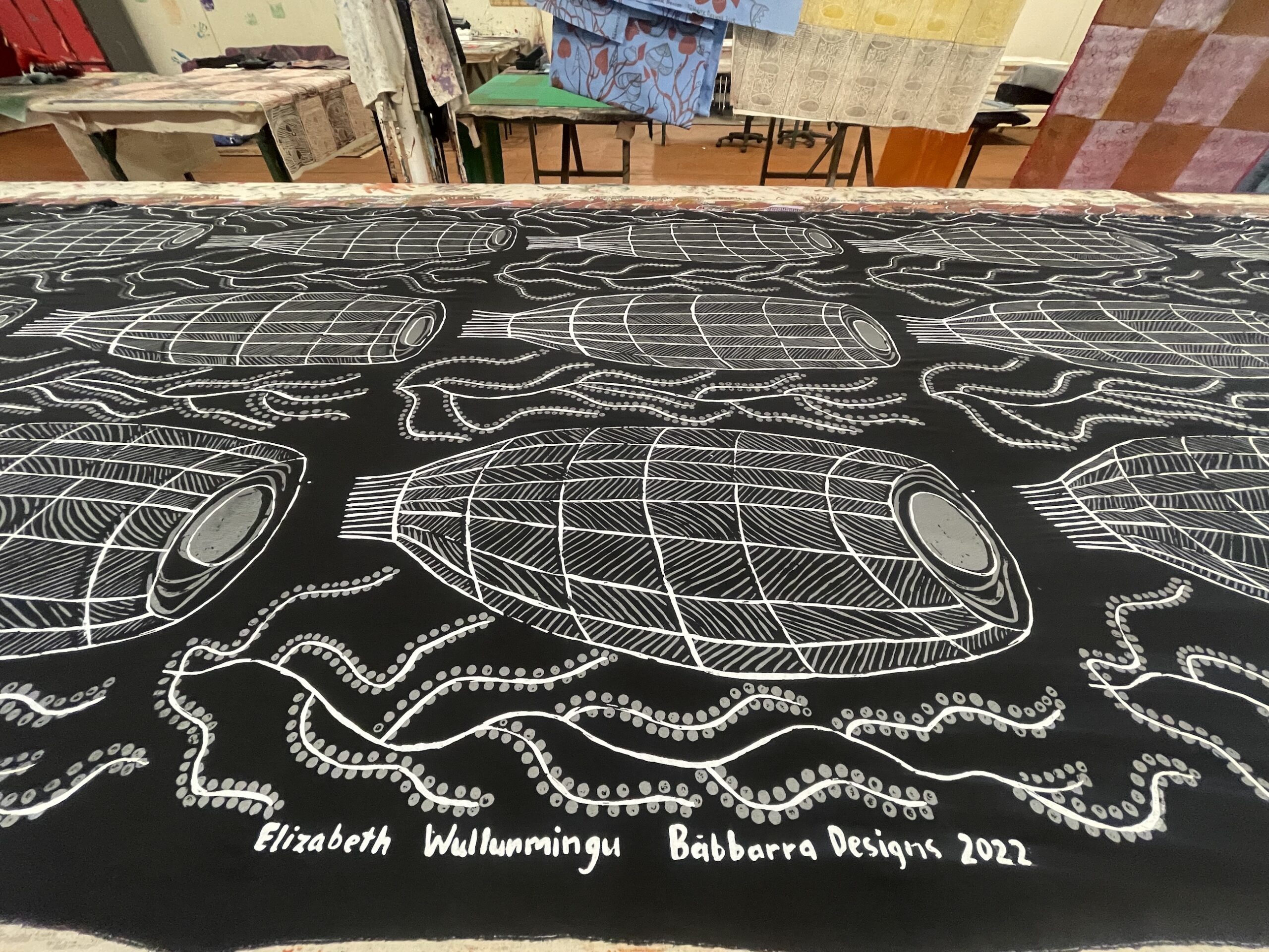 Elizabeth obtained permission from her djunkay to create a screen print design about a historic object traditionally used to trap fish in rivers, creeks, and estuaries.