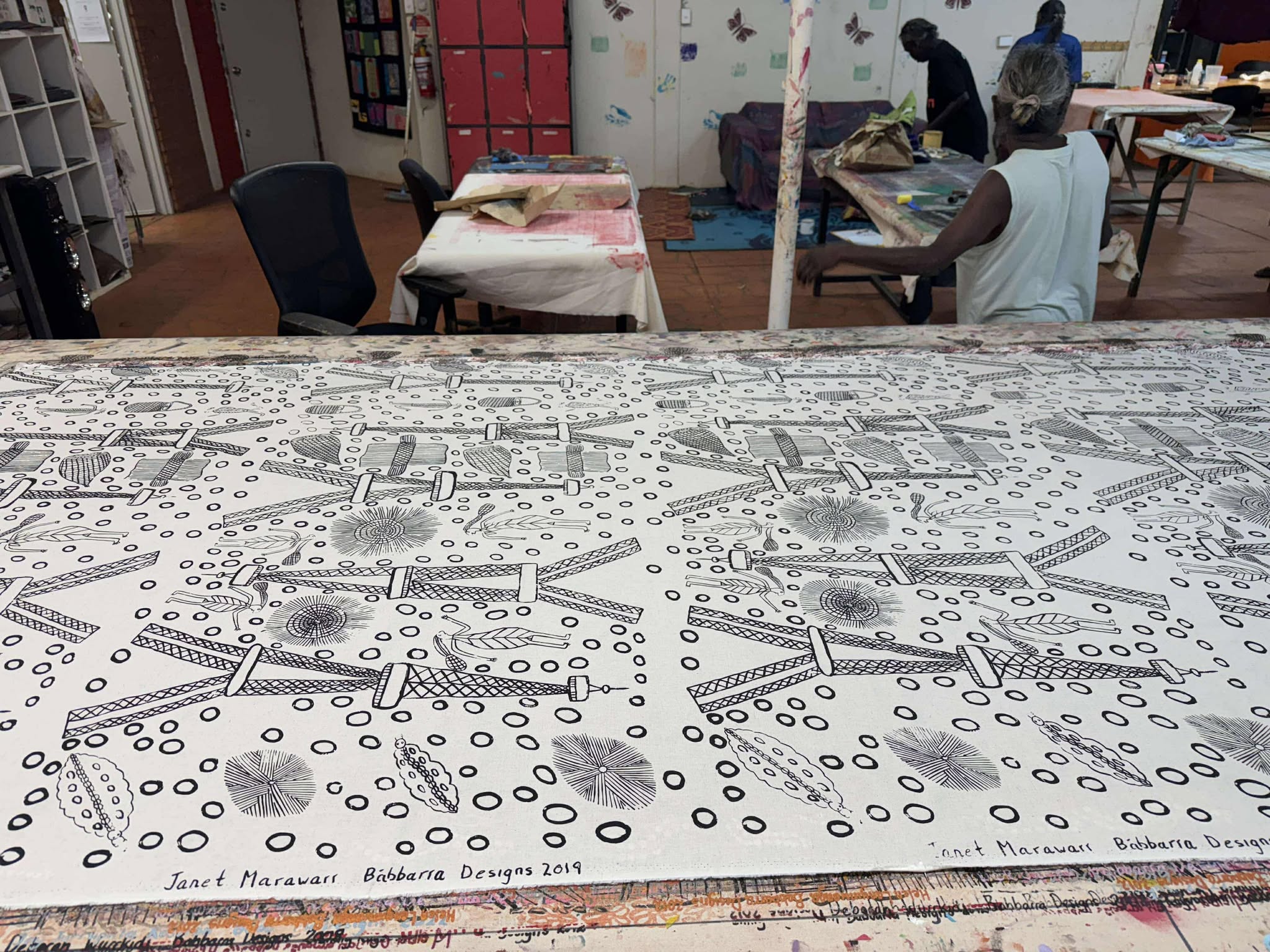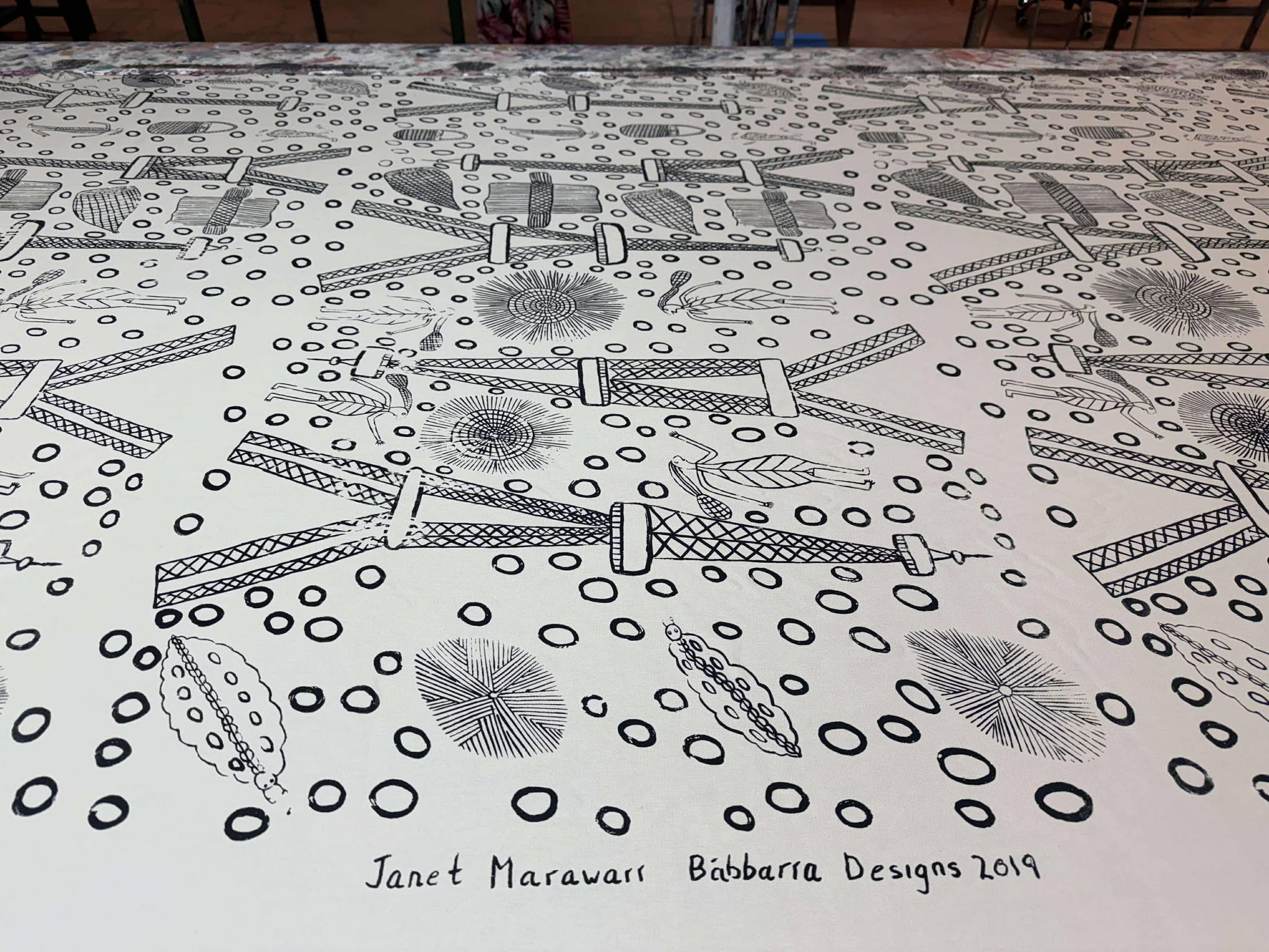 We came to Maningrida, I started to draw. I drew that tower from France, but also I drew maladj (stone country orphan spirit), women’s sacred woven mat, fish traps and rolk (insects). I also put round kunngol (clouds) in the design, those circles. That maladj spirit, it’s standing there next to the Eiffel tower, looking at the dancing lights at night. The tower is from Paris, but everything else in my design I took from my mother’s country and my father’s country.