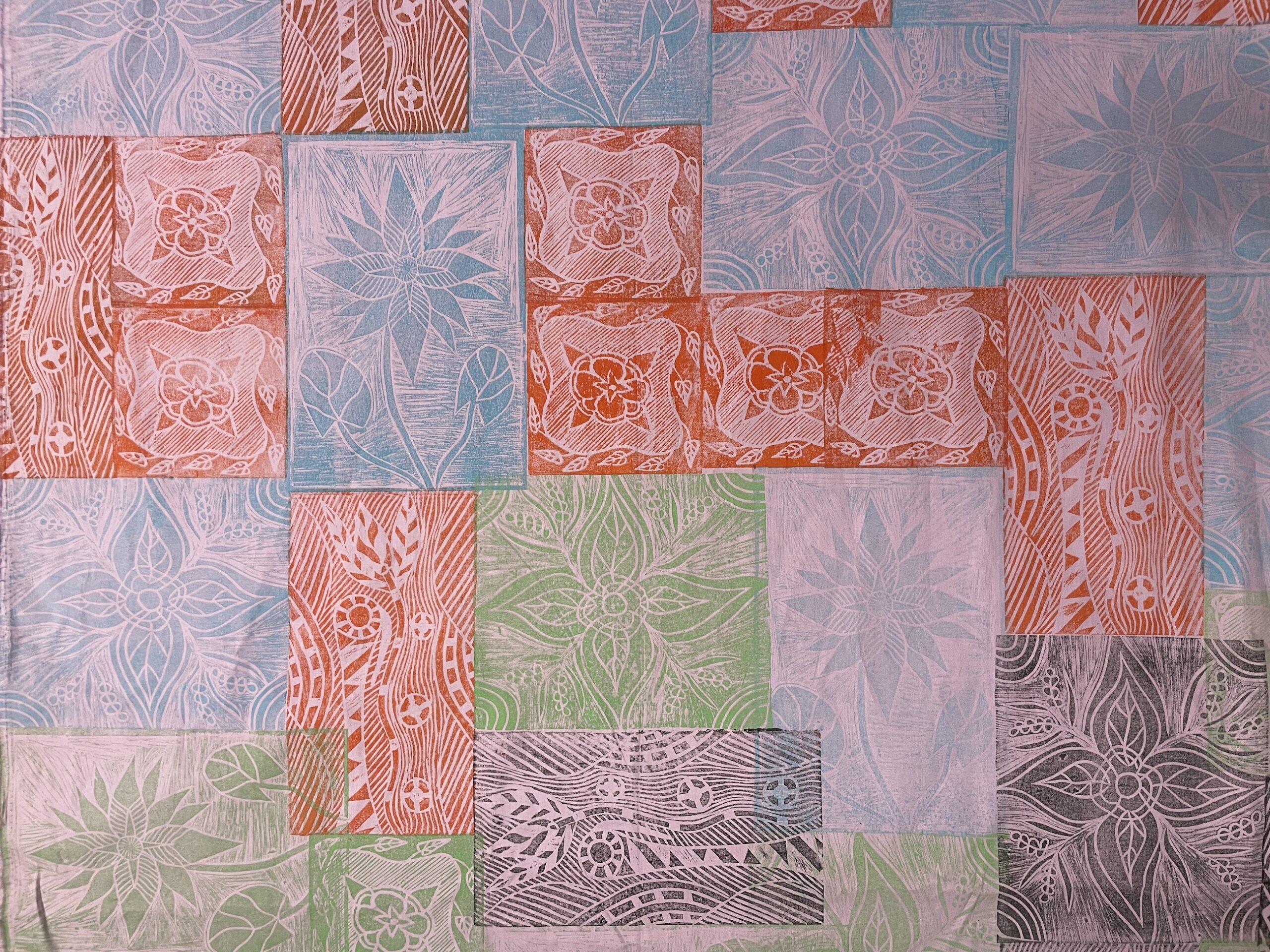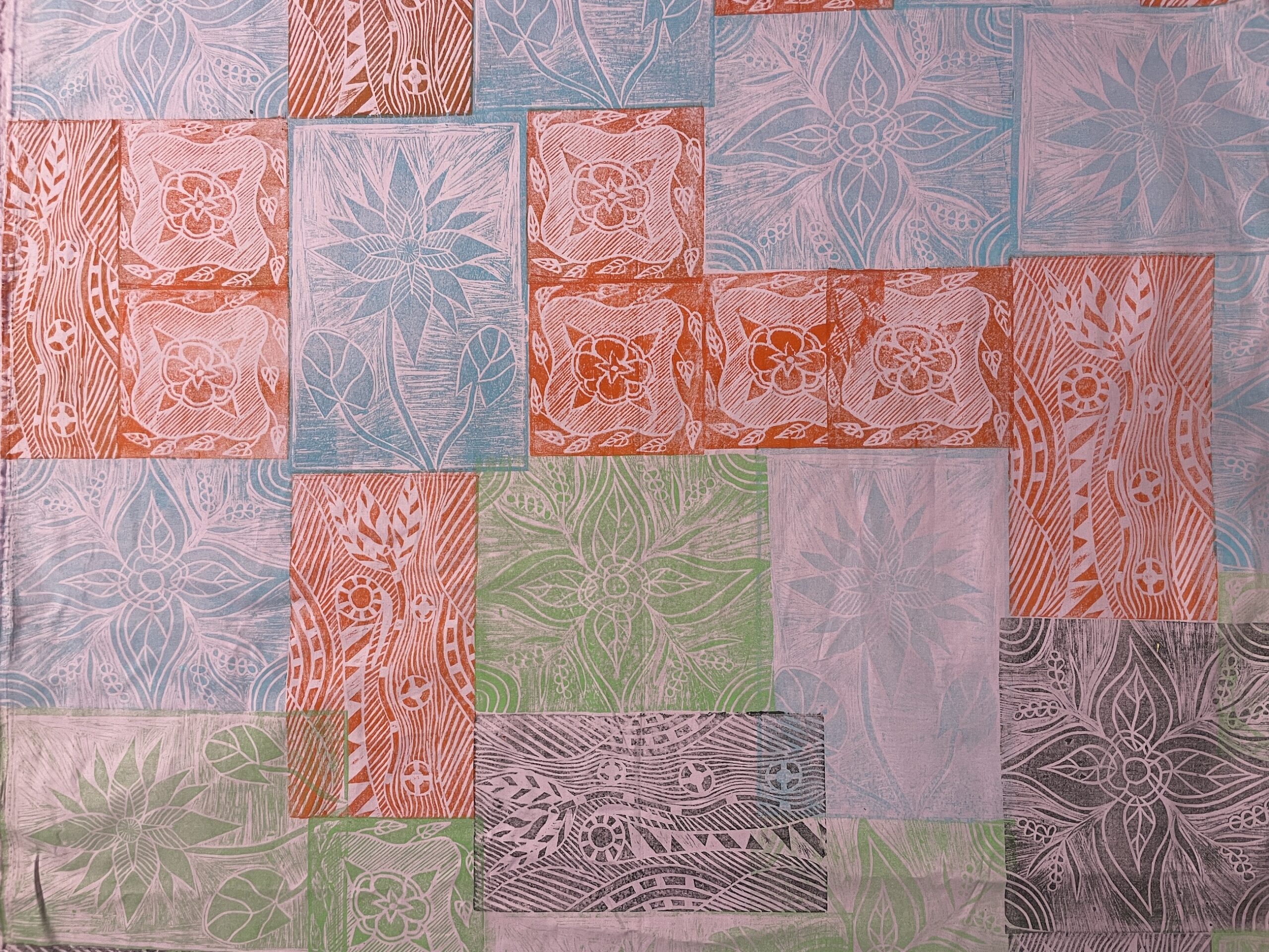 A  multicolored cloth with interlocking designs in a patchwork repeat. This cloth was printed by hand using the linocut technique.