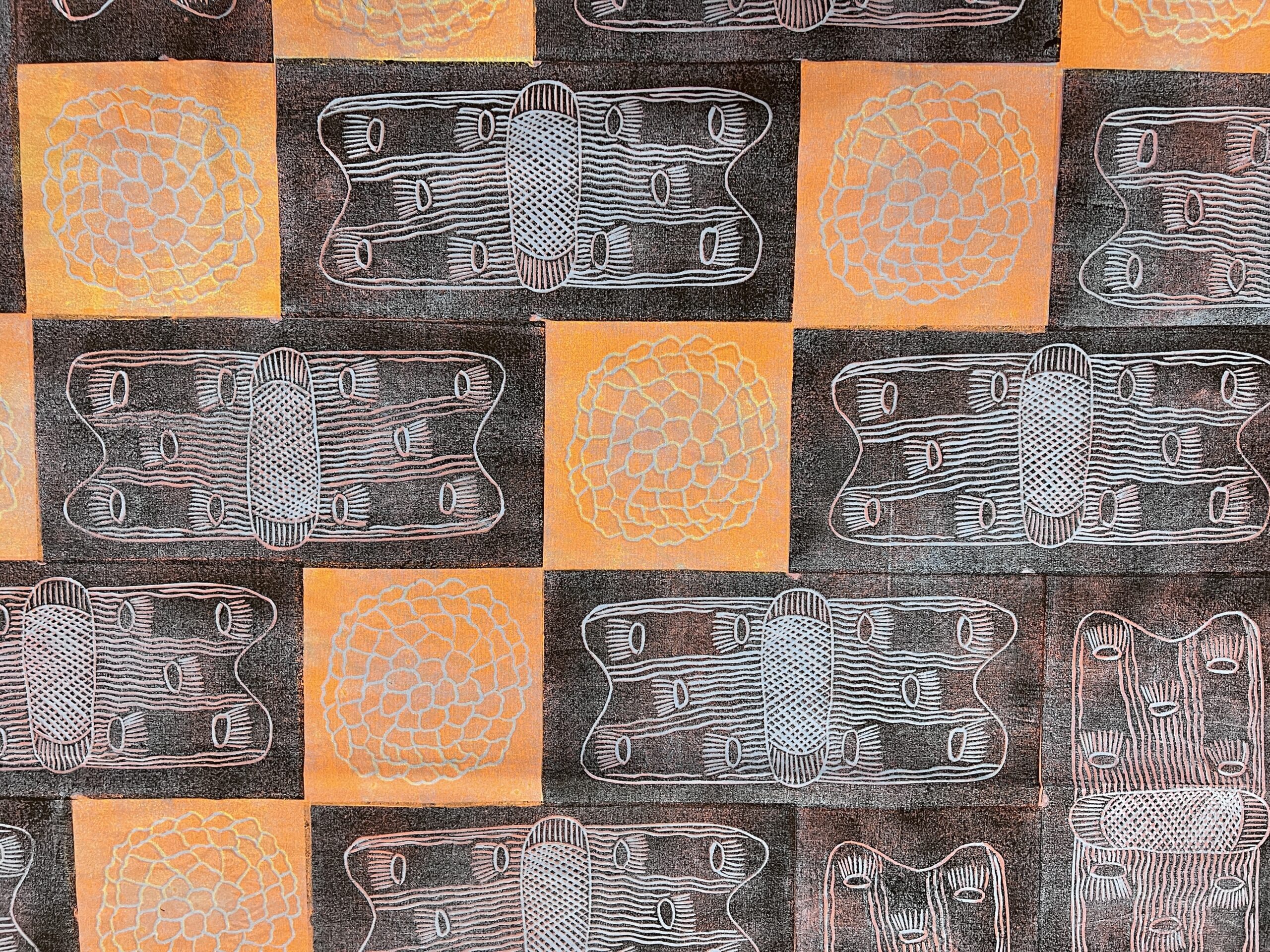 Janet Marawarr has depicted kunkurra, the spiralling wind associated with several sites in the Kardbam clan. On one level, this design can be interpreted as a depiction of the kinds of mini-cyclones common during the wet season in Arnhem Land, where the artist lives. Kunkurra also relates specifically to a site called Bilwoyinj, near Mankorlod, on the artist’s clan estate.