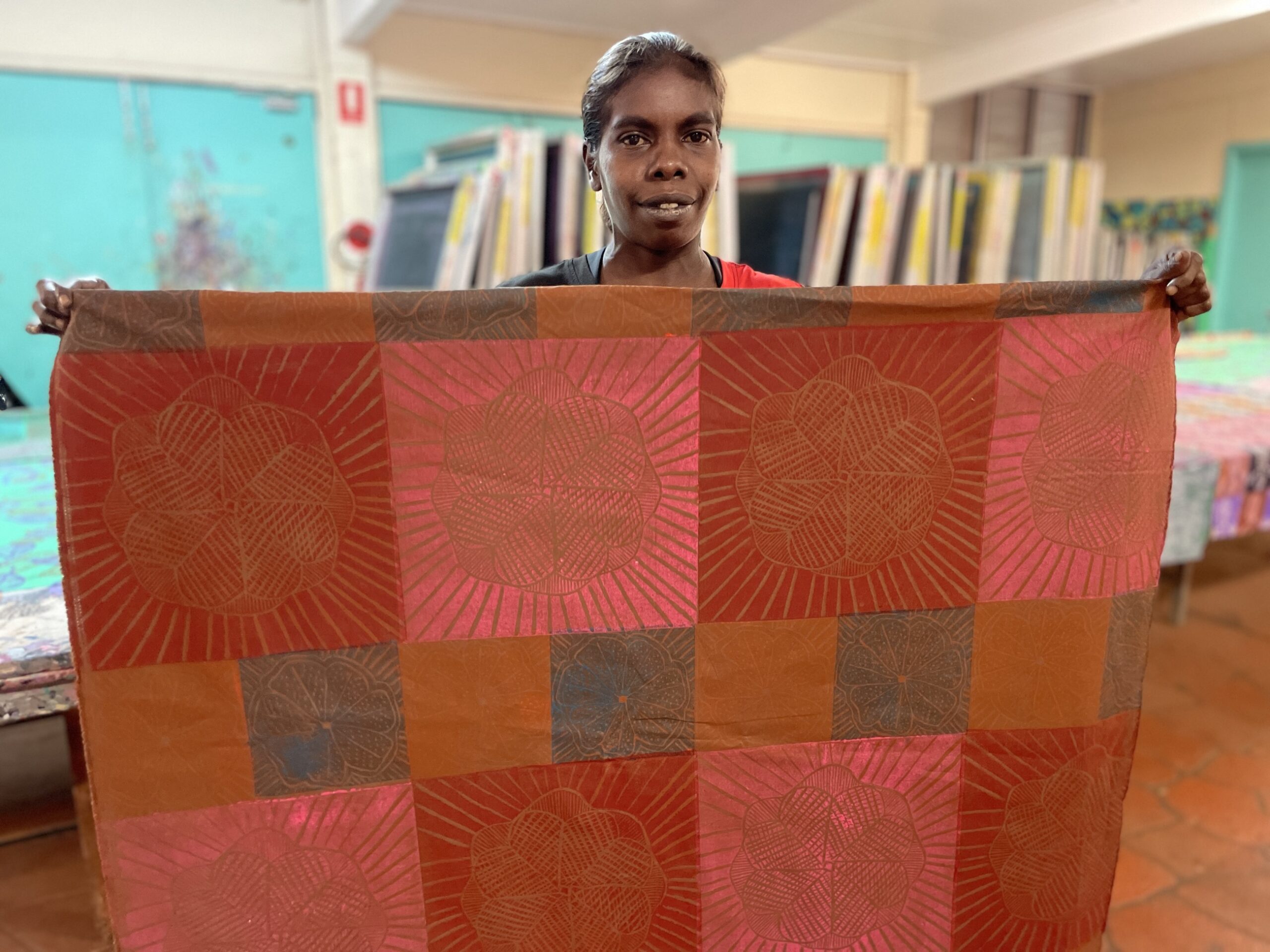 This fabric was created using the linocut printing technique. The lino tile has been carved by the artist in Maningrida, and has been printed by hand using a variety of colours and layers. The linocut technique ensures each textile piece is a one-off, limited edition piece. Bábbarra Women’s Centre supports the economic independence of Indigenous women in the Arnhem Land community of Maningrida, Northern Territory, Australia. Designs created by the women at Bábbarra reflect strong cultural knowledge, which is passed down to younger generations through their textile design practice.