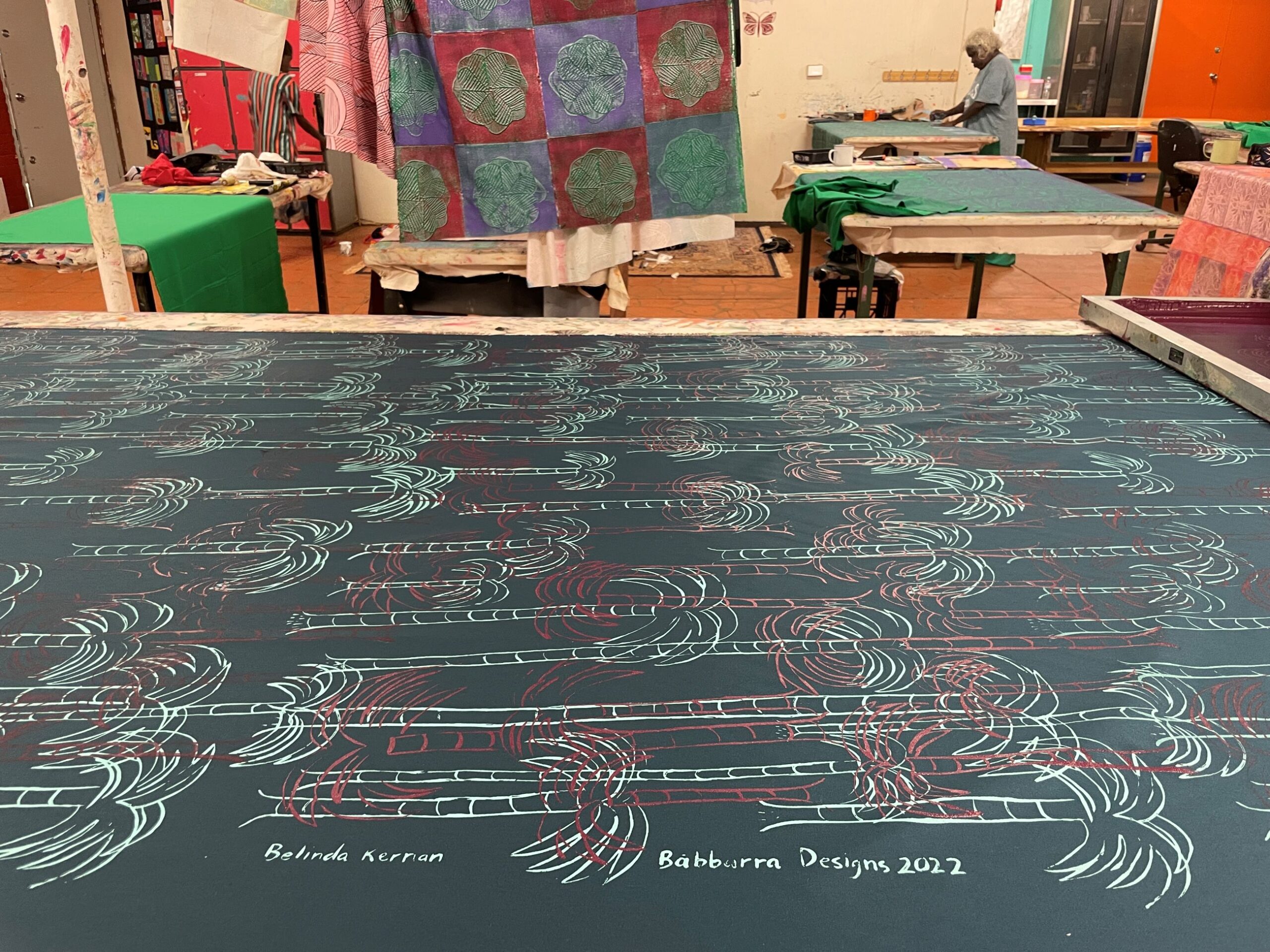 Beautiful deep green cotton drill with aqua and burgundy fabric paint.