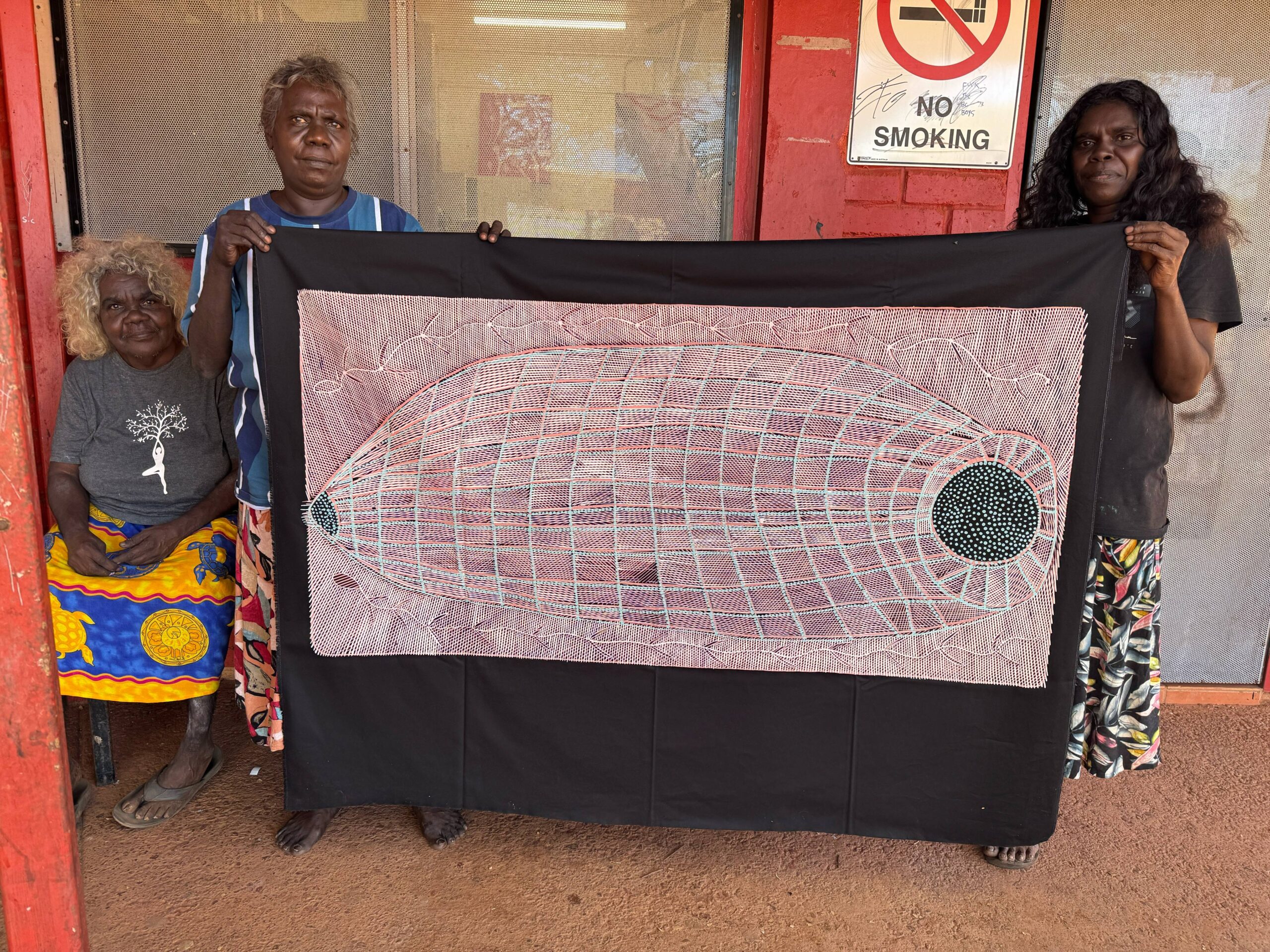 To make mandjabu, weavers firstly harvest milil (burney vine, Malaisia scandens) and put it in water overnight to make it soft. Then they start weaving it; they make rings for the inside to keep the fish trap’s shape. People also make string from the bark of burdaga (kurrajong) to attach the bardainy (hibiscus) rings and to tie the conical end of the fish trap. It’s hard work and it can take three or four weeks to make a fish trap. People also use fish-net fences called kunkarlewabe. They would put the kunkarlewabe across rivers and creeks. In the middle they would place the mandjabu. They also used small things like sticks, rocks, mud and grass to block the fish from going through. This way we would catch fish such as saltwater barramundi rajarra, ngaldadmurrng (freshwater barramundi), small black freshwater catfish (buliya), bonefish (an-guwirrpiya), and sand bass (dalakan) in the mandjabu.