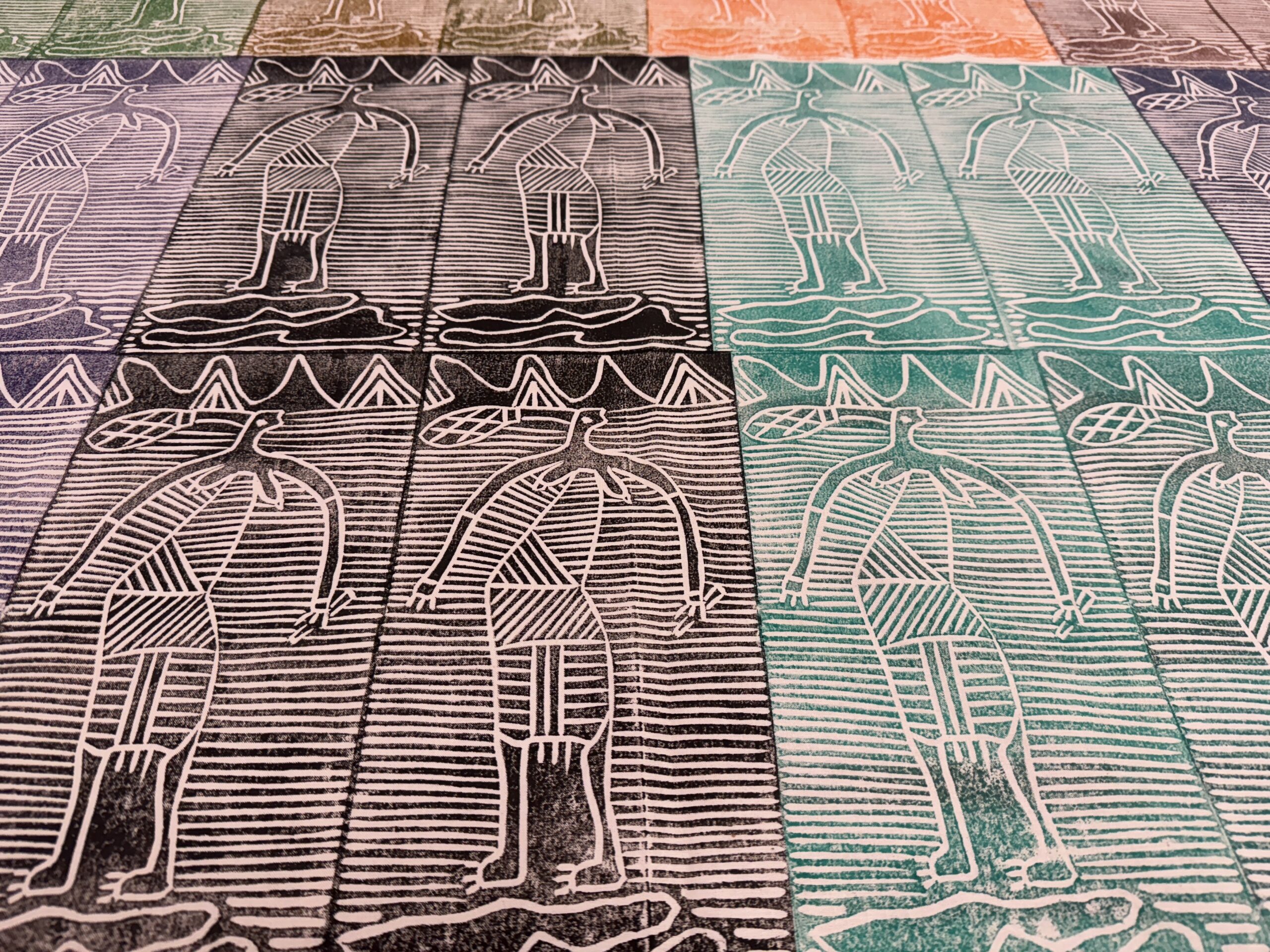 Bábbarra is a Djomi, a freshwater mermaid, and she is often depicted with human legs, as she takes on many different forms. Raylene Bonson’s father designed the original logo for the Bábbarra Women’s Centre. Joy Garlbin, with some technical assistance from Raylene Bonson, created a lino print design to share the story of the Bábbarra Djomi.