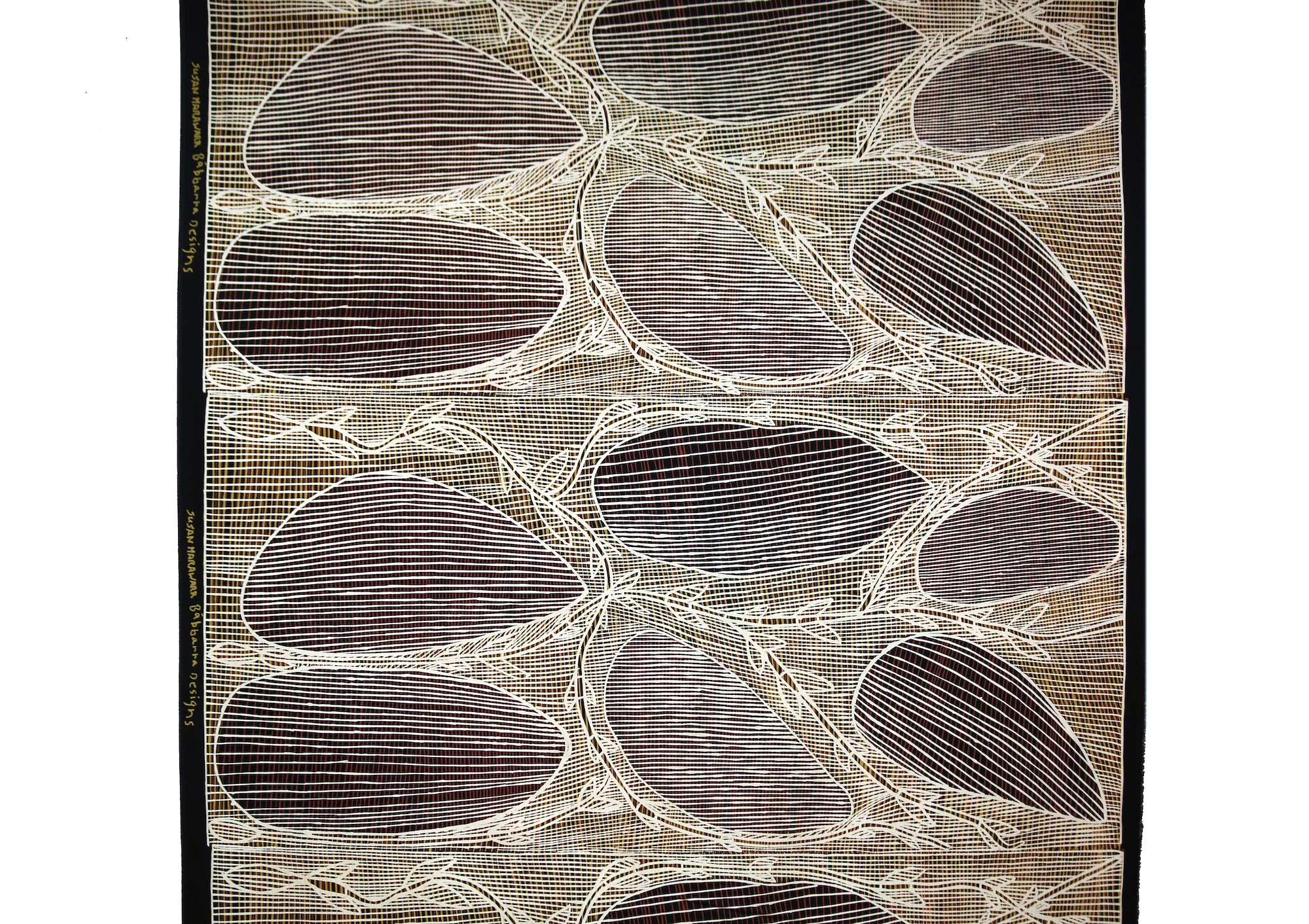 Susan Marawarr is a Kuninjku artist from the Kurulk clan whose country lies around the outstation of Mumeka in central Arnhem Land. In this design, she has depicted karrbarda (long yam) on her traditional country, the kunwardde (stone country).