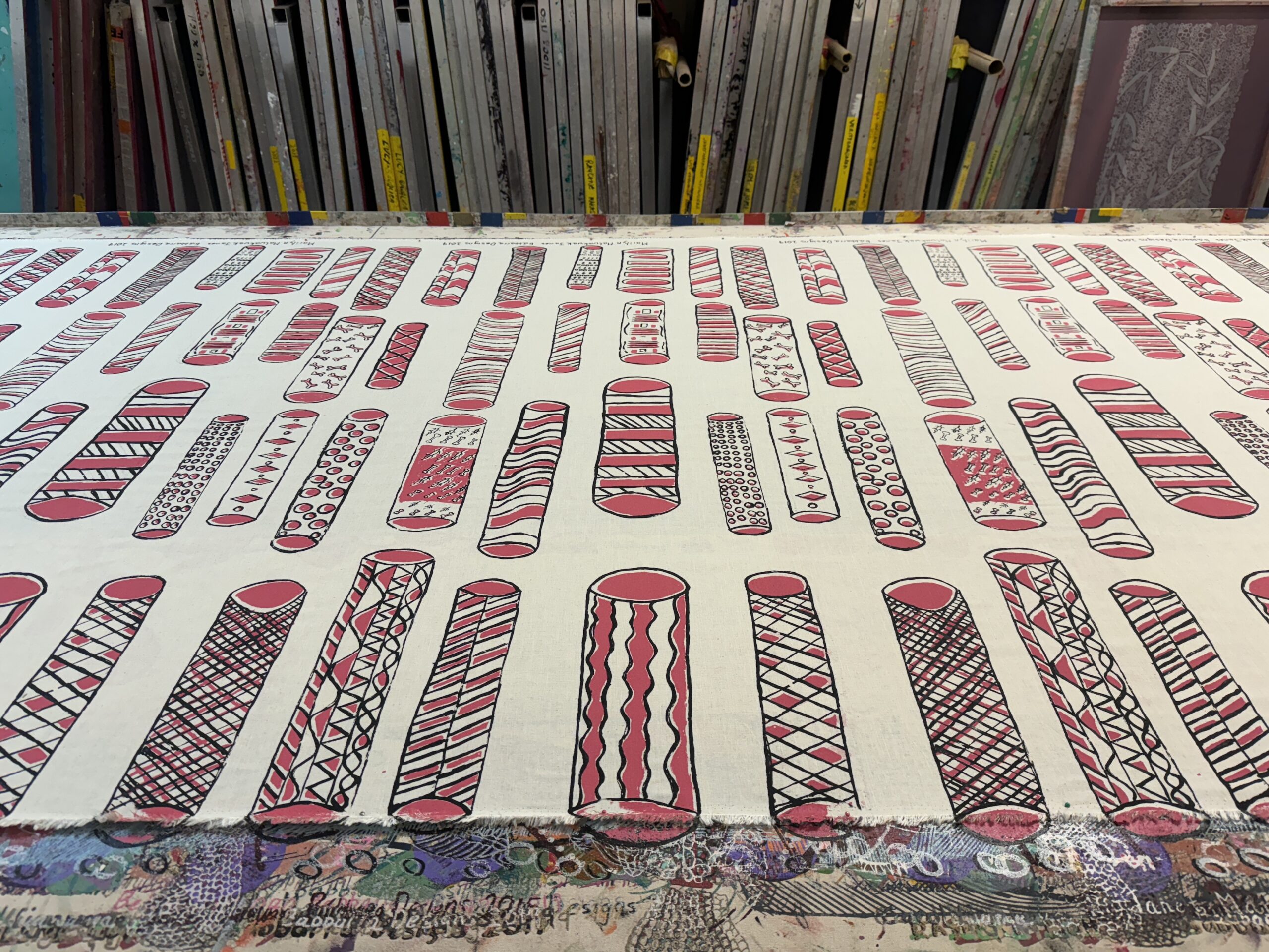 Marilyn’s first screen print design depicts the story of lorrkkon (hollow funeral logs). This the story of her great, great grandfather and grandmother who were bark painters, as well as also sacred lorrkkon painters.