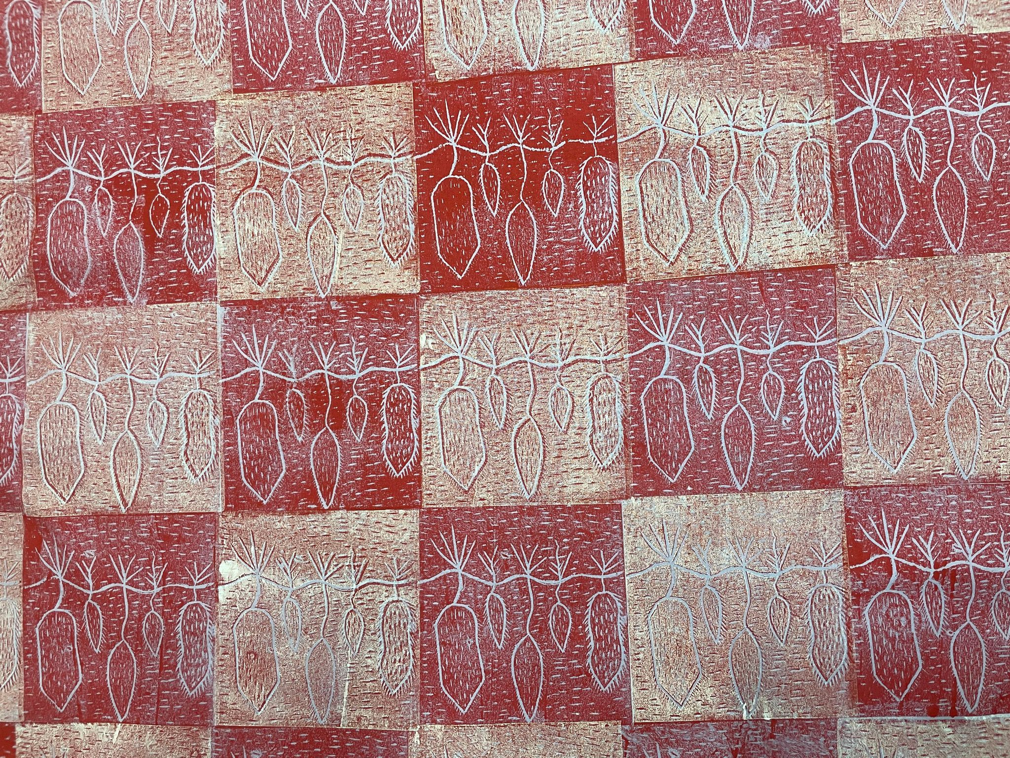 Artwork context navigation Shop > LINO PRINT FABRIC > Item 56 of 134 Nja-nmarrúkkama (bush potato)$187.00 1 in stock Nja-nmarrúkkama (bush potato) quantity Add to cart A kind of bush food: bush potato, white yam. *Ndjebbana Marilyn has printed red and cream on a cornflower blue cotton. Dimensions: 170cm x 110cm Cat no. : 45-24 Artist Marilyn James(7 artworks artworks) Size & material 170cm x 110cm Cotton 100% In stock Categories LINO PRINT FABRIC