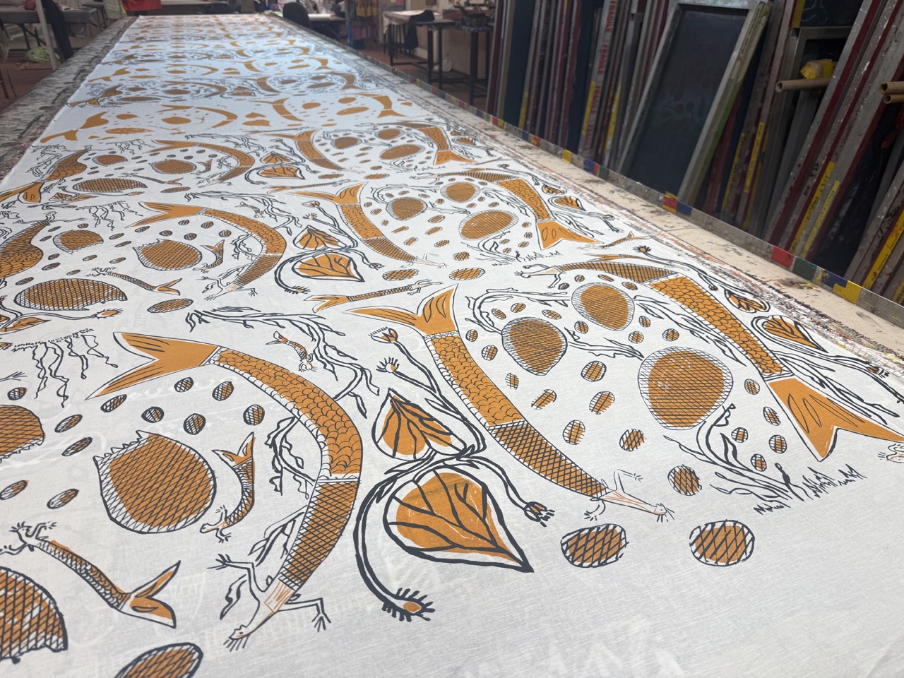 “If you go there, you can get pregnant easily. Djómi has babies, and they can give other babies too. The Djómi spirit is so powerful, that women can end up with multiple babies at once, twins or sometimes even more. The Djómi spirits lay eggs near the sacred freshwater stream in Maningrida. Inside the eggs are human babies as well as young Djómi. Men do not go near that swamp, because Djomi is so powerful that men might get pregnant there too. So men are too scared of that Djómi. When we visit the Djómi freshwater spring, we can hear young Djómi crying. They sound like normal babies crying, those Djómi spirits. They are looking for a mother. This Djómi is my dreaming, I got permission from my djungkay (ritual manager) to paint this Djómi design. For me I always ask my djunguy permission to paint, because that is our cultural way. This design also depicts the freshwater lily leaves and seaweed from the base of the sea floor.” Joy Galrbin