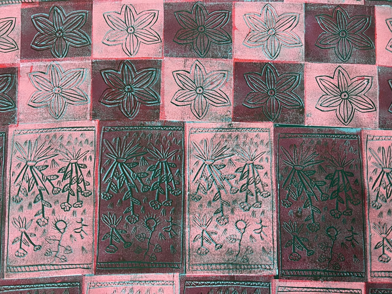 This fabric was created using the linocut printing technique. The lino tile has been carved by the artist in Maningrida, and has been printed by hand using a variety of colours and layers. The linocut technique ensures each textile piece is a one-off, limited edition piece. Bábbarra Women’s Centre supports the economic independence of Indigenous women in the Arnhem Land community of Maningrida, Northern Territory, Australia. Designs created by the women at Bábbarra reflect strong cultural knowledge, which is passed down to younger generations through their textile design practice.