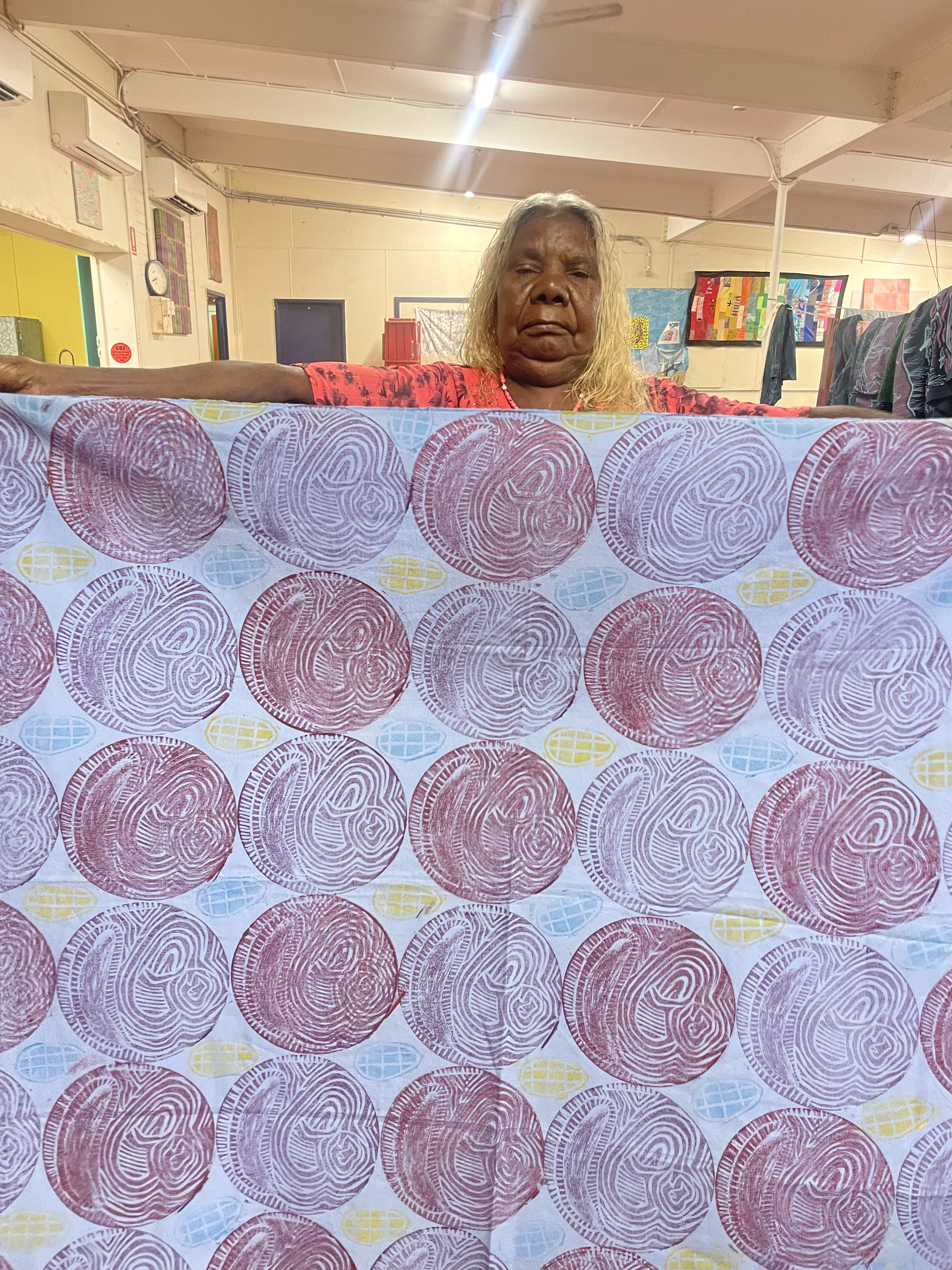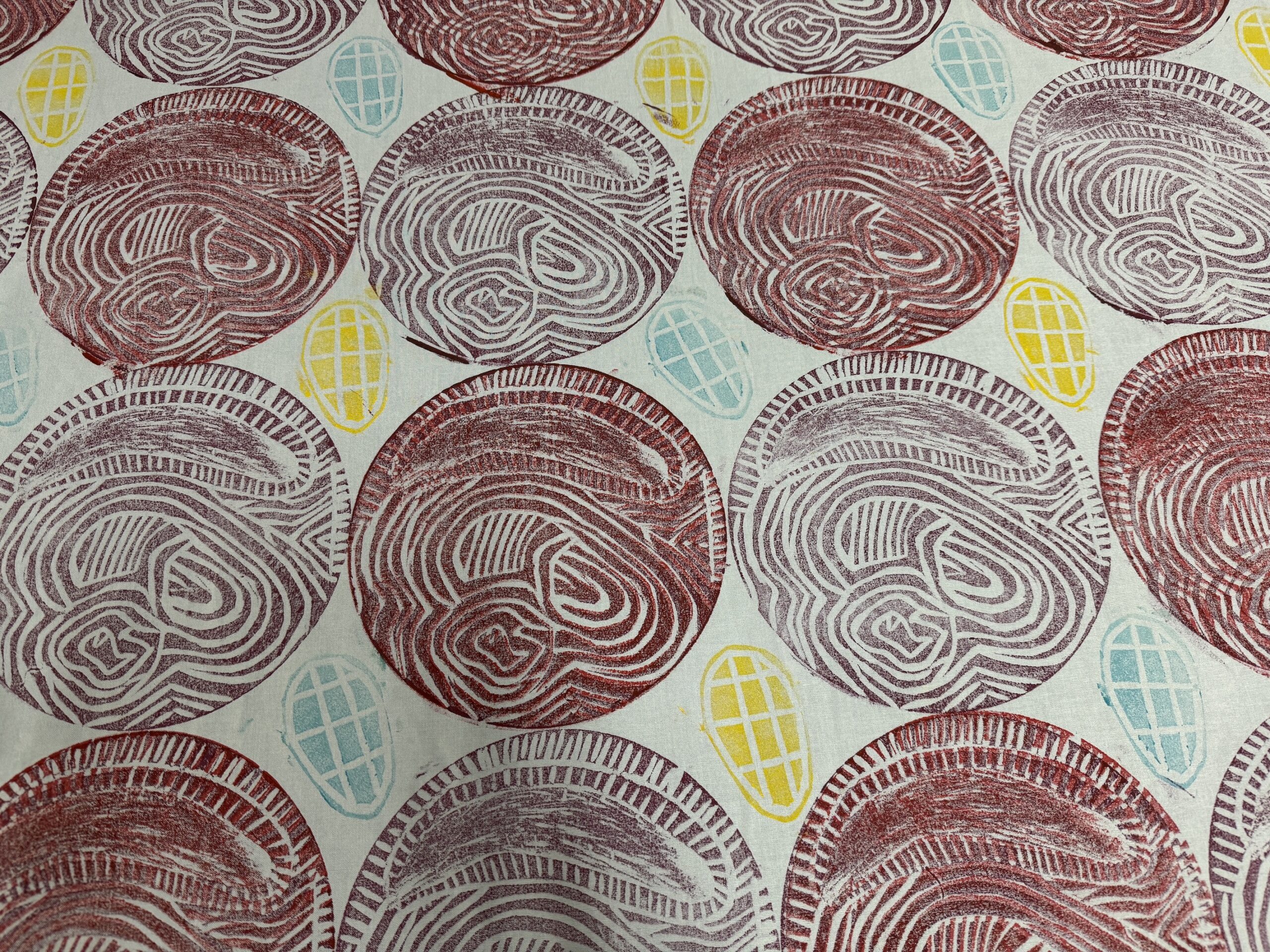 This fabric was created using the linocut printing technique. The lino tile has been carved by the artist in Maningrida, and has been printed by hand using a variety of colours and layers. The linocut technique ensures each textile piece is a one-off, limited edition piece. Bábbarra Women’s Centre supports the economic independence of Indigenous women in the Arnhem Land community of Maningrida, Northern Territory, Australia. Designs created by the women at Bábbarra reflect strong cultural knowledge, which is passed down to younger generations through their textile design practice.