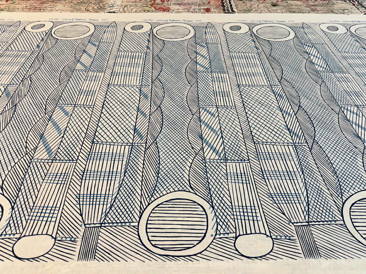 In this design, Jennifer has depicted kun-madj (dillybag), which is a large woven collecting basket. These large bags are often made from the burney vine (Malaisia scandens), a strong, pliable plant that grows along the ground and into the canopy of monsoon vine thickets. The bags are used to collect heavy foods, such as fish caught in conical fish traps or yams. They can also be made from kun-dayarr (Pandanus spiralis), a palm that grows in many areas of Arnhem Land. Tightly woven dillybags are used to collect sugarbag, the native honey.