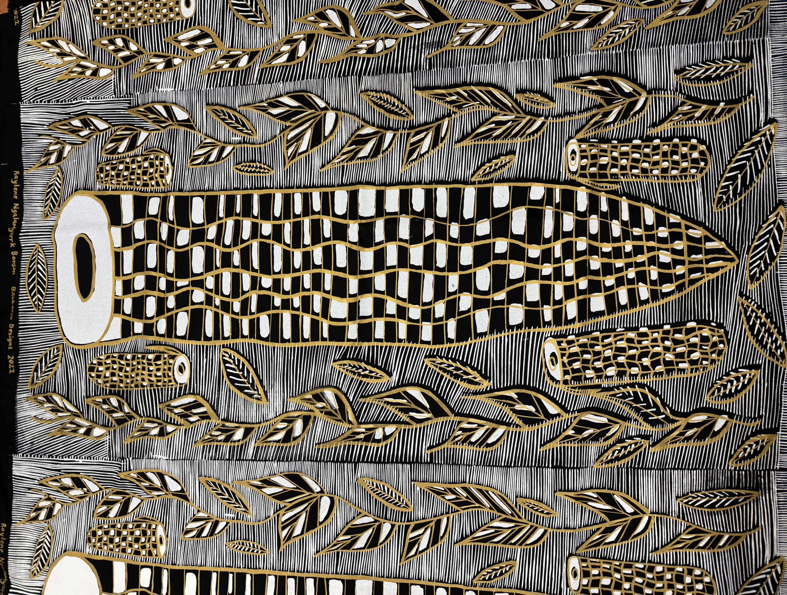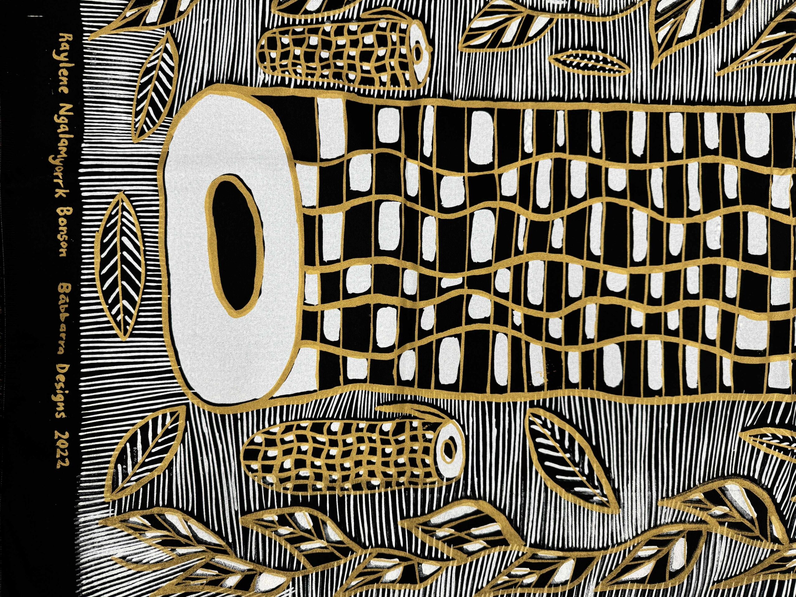 A new design made in 2022 featuring a mandjabu (fish trap), kunmadj (dilly bag) and fresh water.