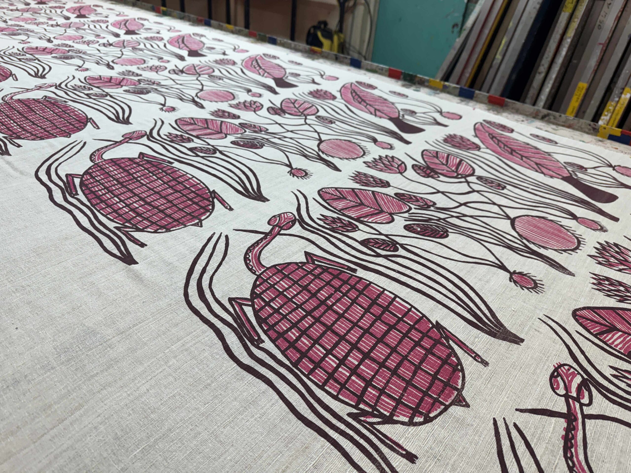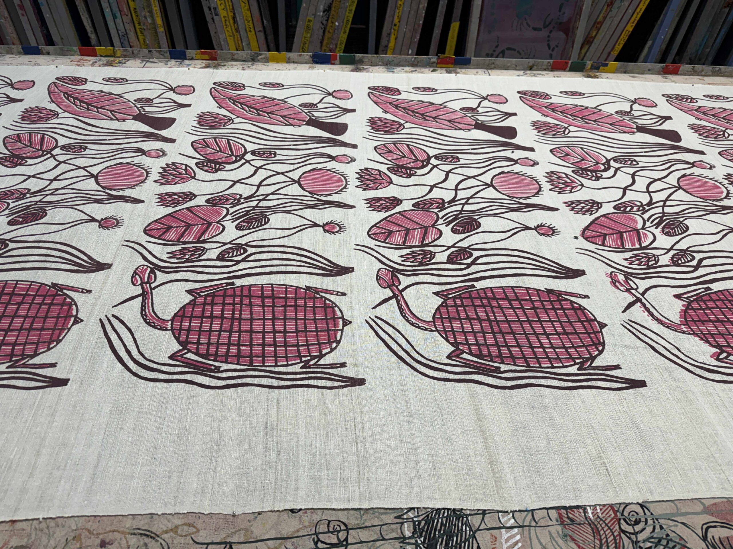 “My country is called Mankorlod. It is near the rock country. My dreaming is komrdawh (long neck turtle), the one I painted in my design. I like to eat komrdaw, it tastes really nice. We catch them in dry and wet season near Mankorlod. This is my first ever design, and I only have one design. I painted it with brush at Babbarra Women’s Centre and I feel proud when people print my design.” Margot Gurawiliwili