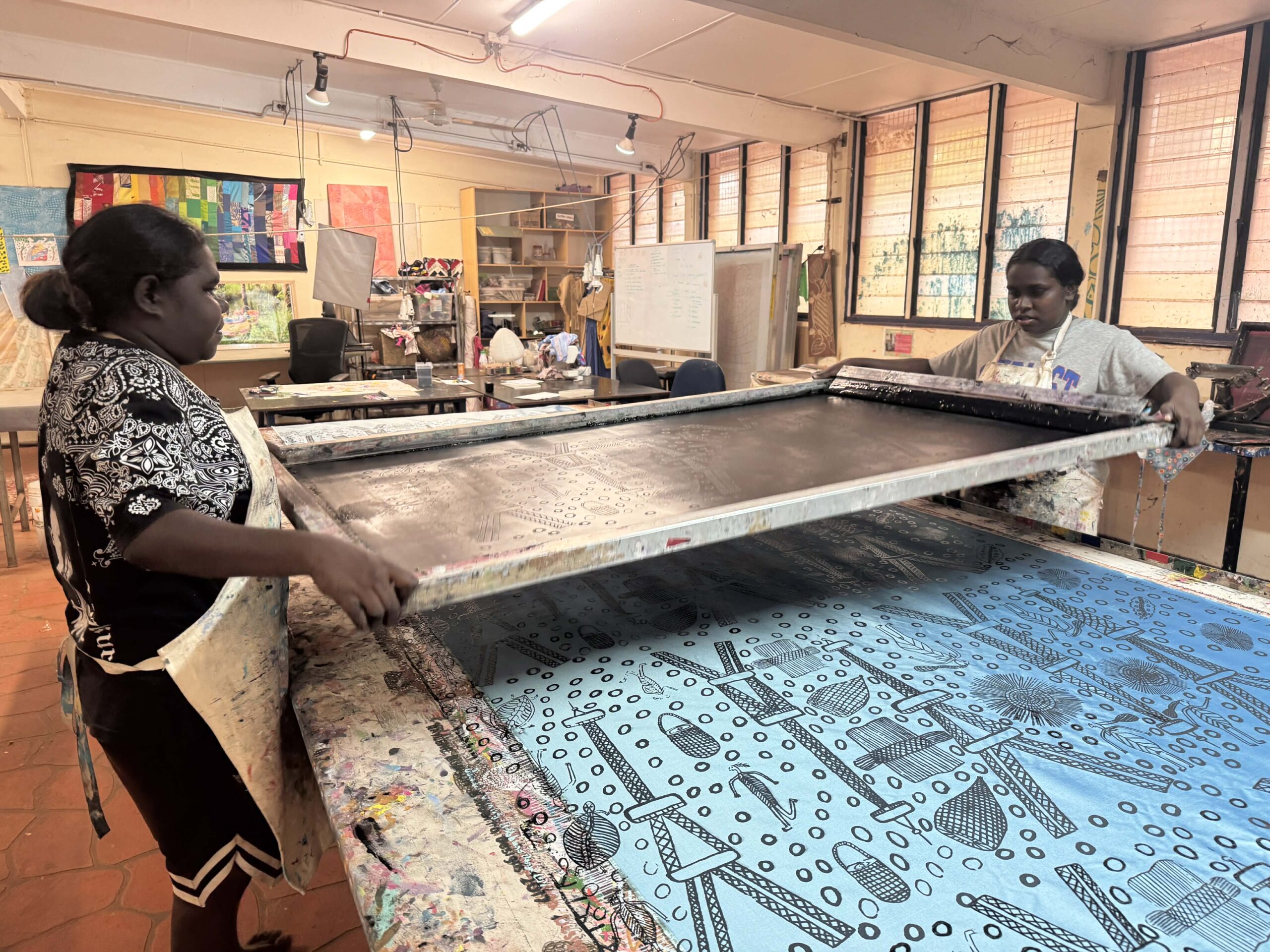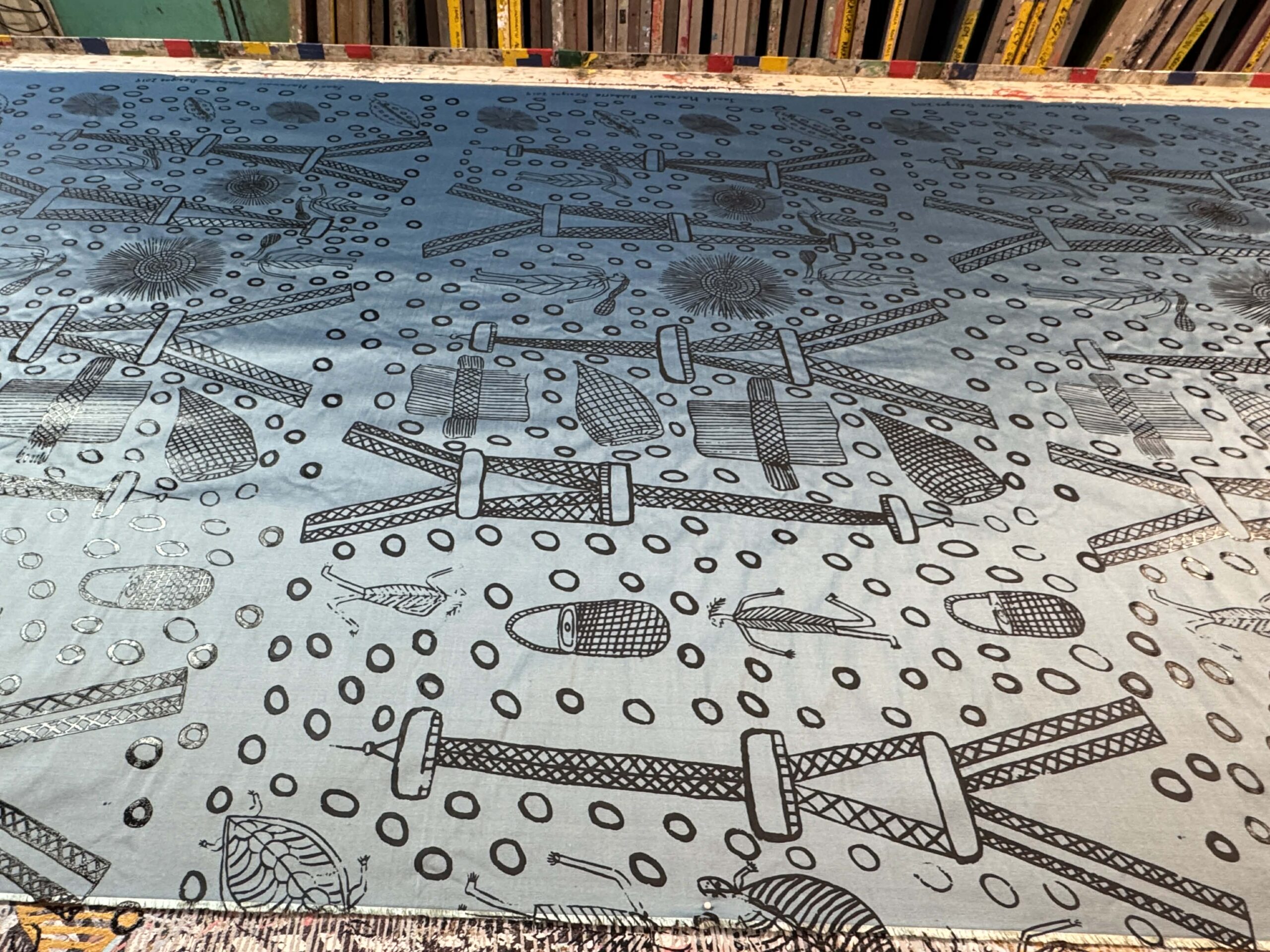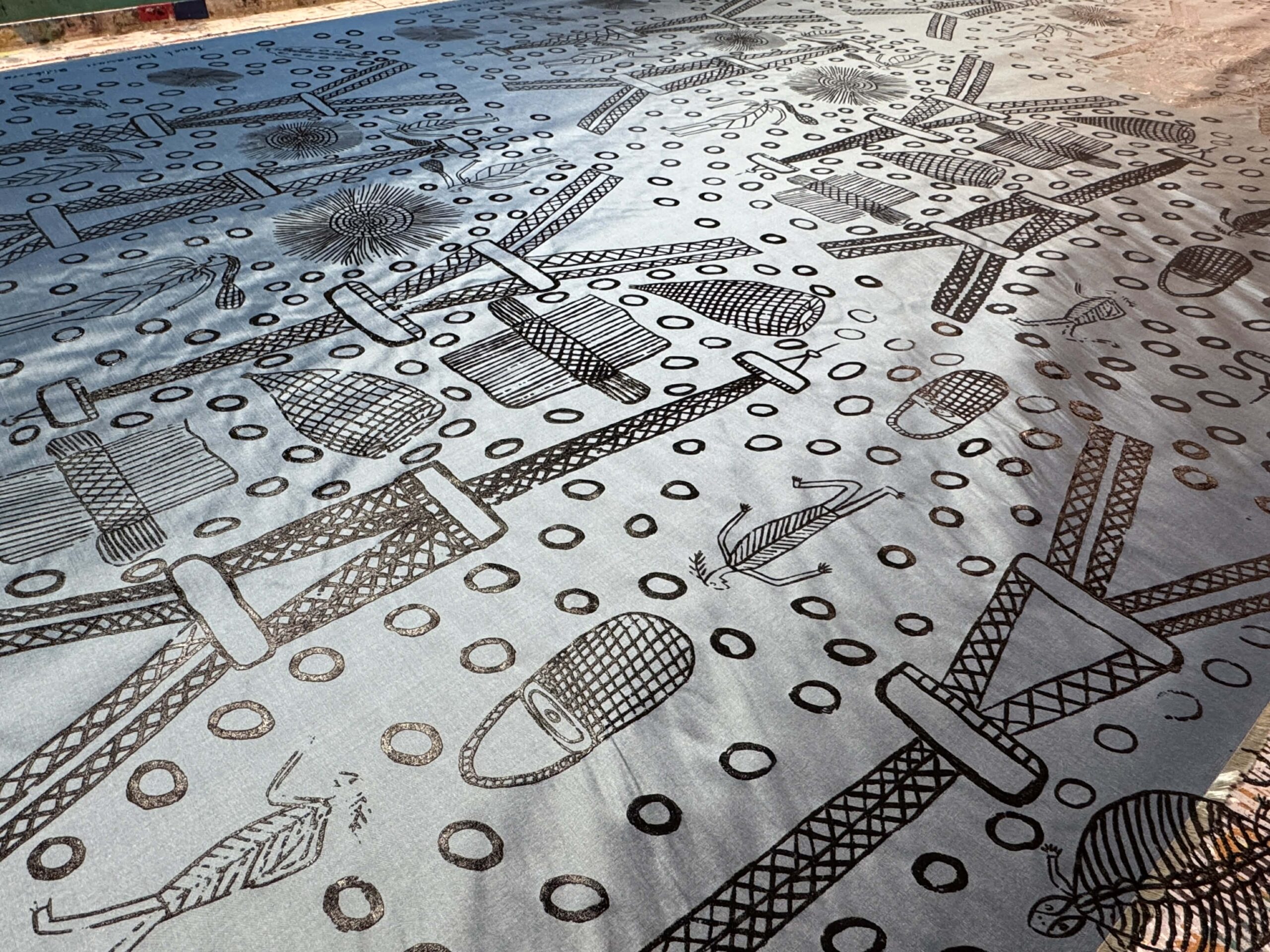 We came to Maningrida, I started to draw. I drew that tower from France, but also I drew maladj (stone country orphan spirit), women’s sacred woven mat, fish traps and rolk (insects). I also put round kunngol (clouds) in the design, those circles. That maladj spirit, it’s standing there next to the Eiffel tower, looking at the dancing lights at night. The tower is from Paris, but everything else in my design I took from my mother’s country and my father’s country.