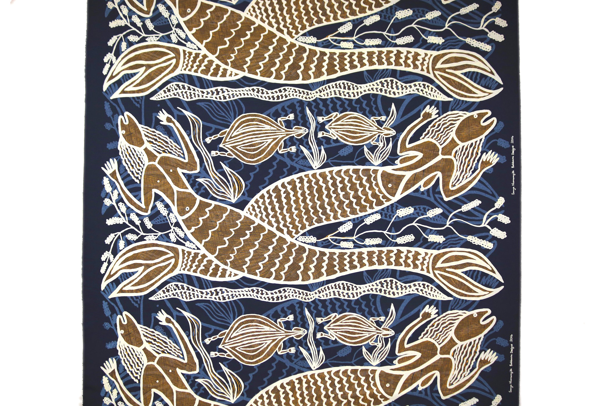 Yawkyawk is a word from the Aboriginal Kuninjku language, meaning ‘young woman’ and ‘young woman spirit being’. Sometimes compared to the European notion of mermaids, yawkyawks are usually depicted with the tails of fish. They have long hair, associated with trailing blooms of algae, typically found in Arnhem Land streams and rock pools.