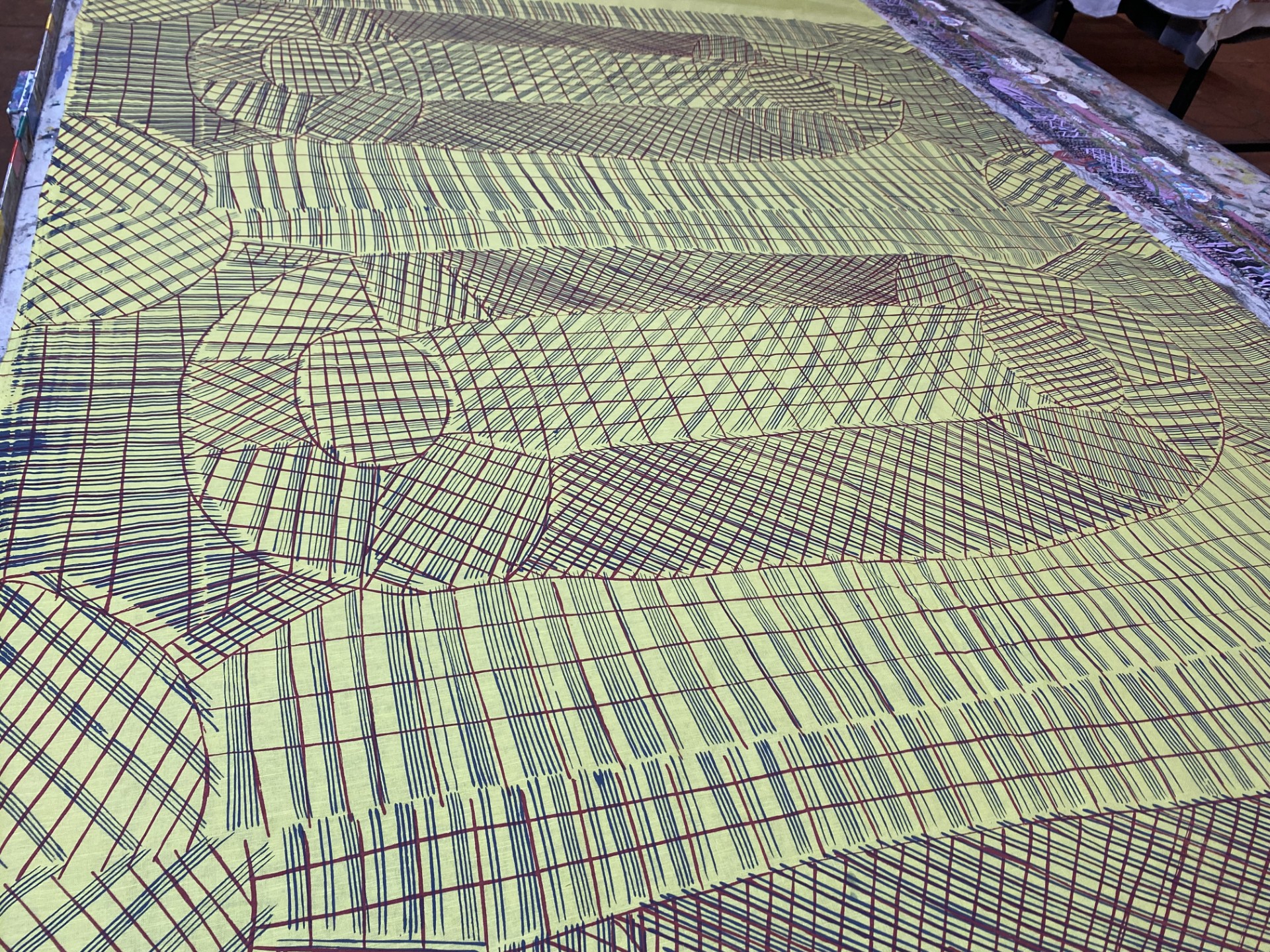 This design depicts a sacred site at ‘Kurrurldul’, an outstation south of Maningrida.
