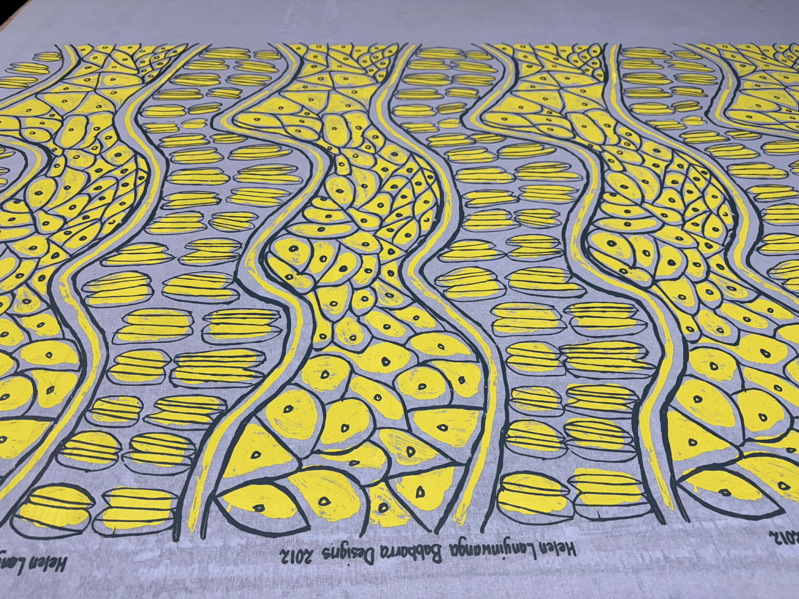 Stunning  neon yellow and dark blue on a dusty blue base cloth.