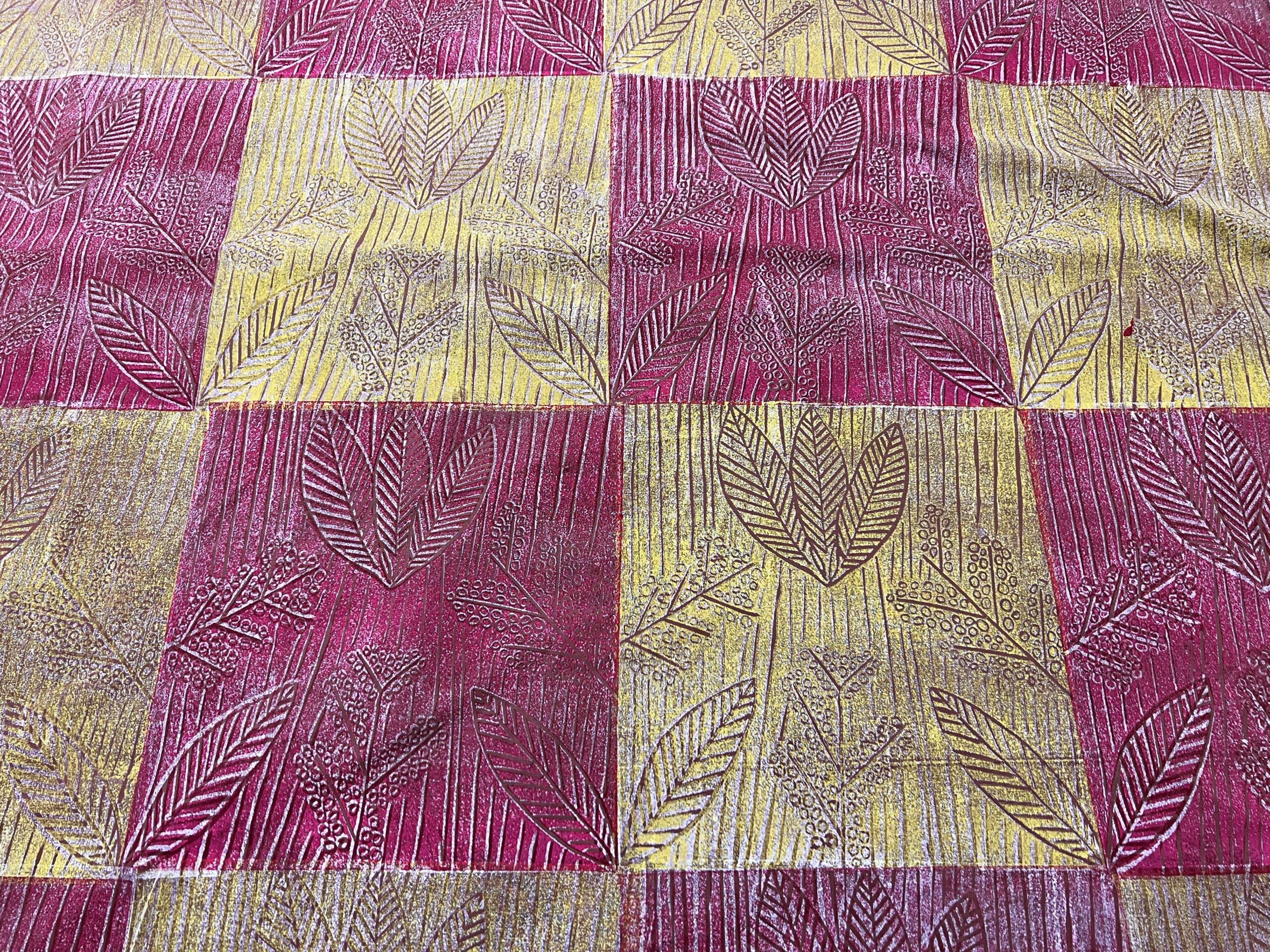 This fabric was created using the linocut printing technique. The lino tile was carved by the artist in Maningrida and printed by hand using a variety of colours and layers. The linocut technique ensures each textile piece is a one-off, limited edition piece.