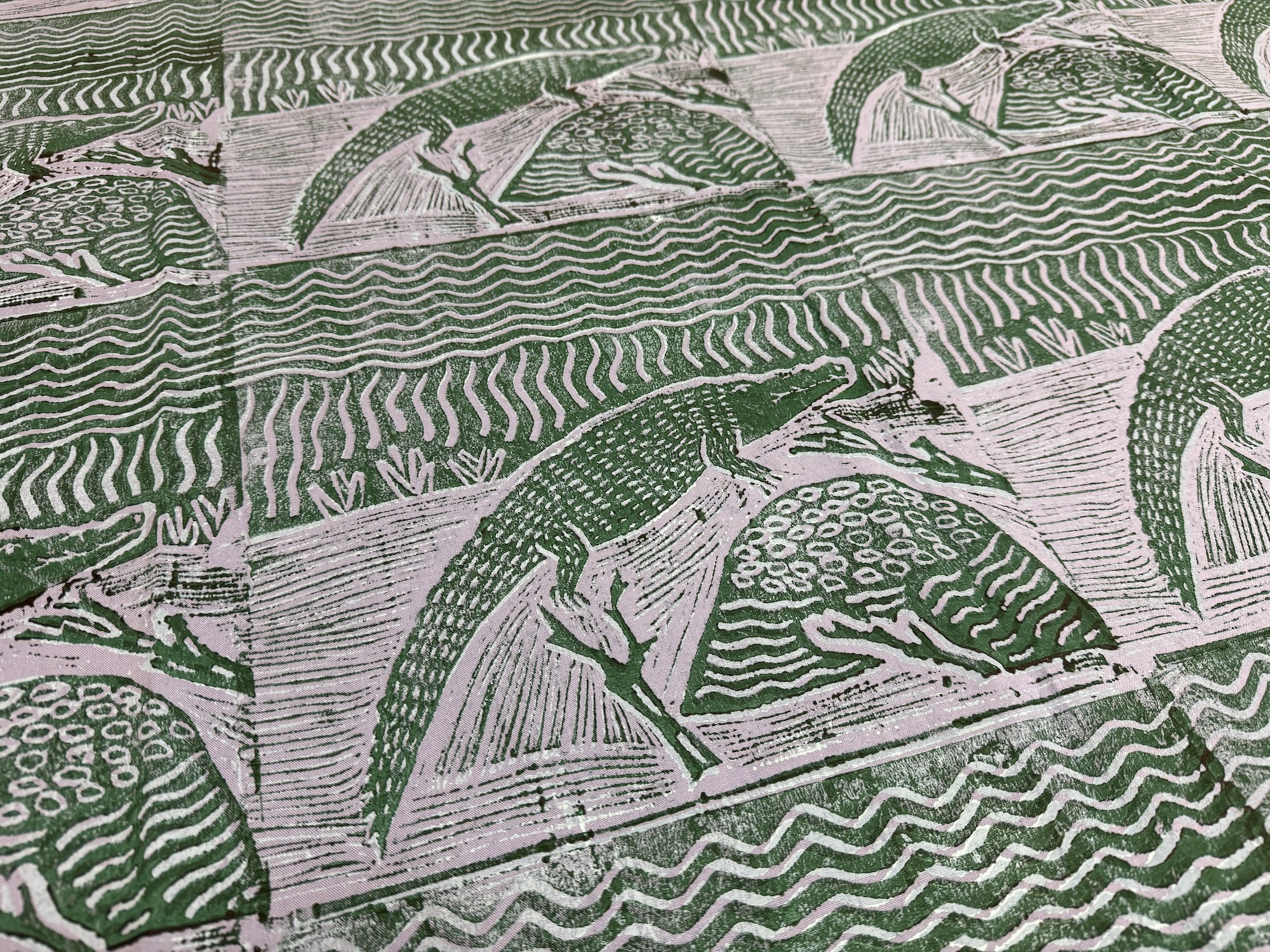A collaborative piece – designed by Jacinta Lamilami and printed by Lucy Yarawanga depicting the story of a crocodile.