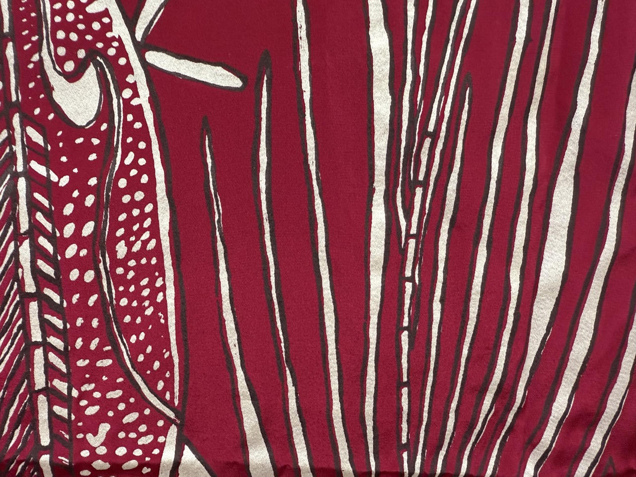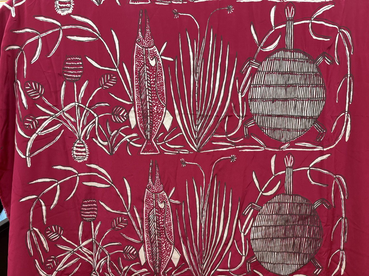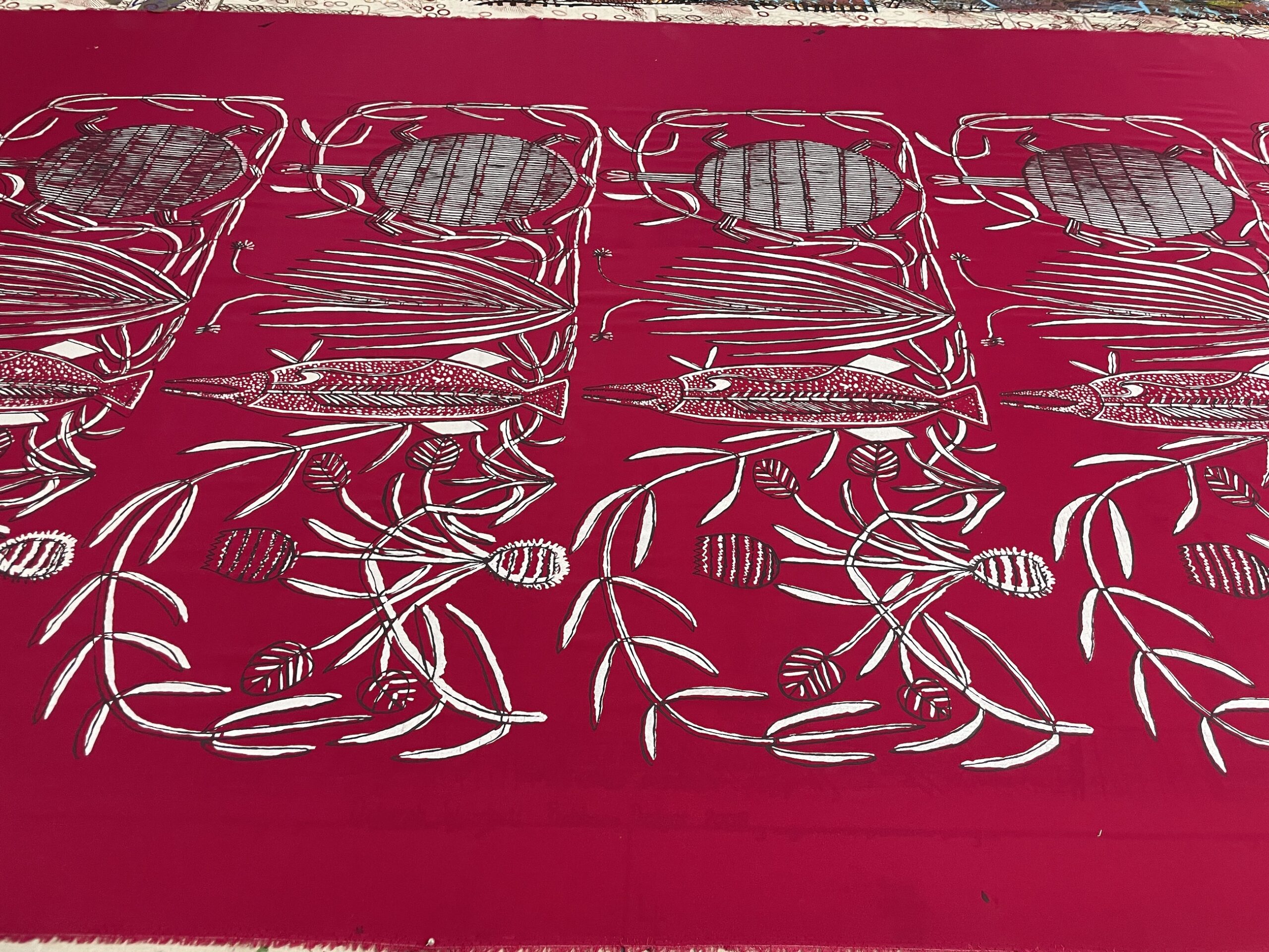 “My country is called Mankorlod. It is near the rock country. My dreaming is komrdawh (long neck turtle), the one I painted in my design. I like to eat komrdaw, it tastes really nice. We catch them in dry and wet season near Mankorlod. This is my first ever design, and I only have one design. I painted it with brush at Babbarra Women’s Centre and I feel proud when people print my design.” Margot Gurawiliwili