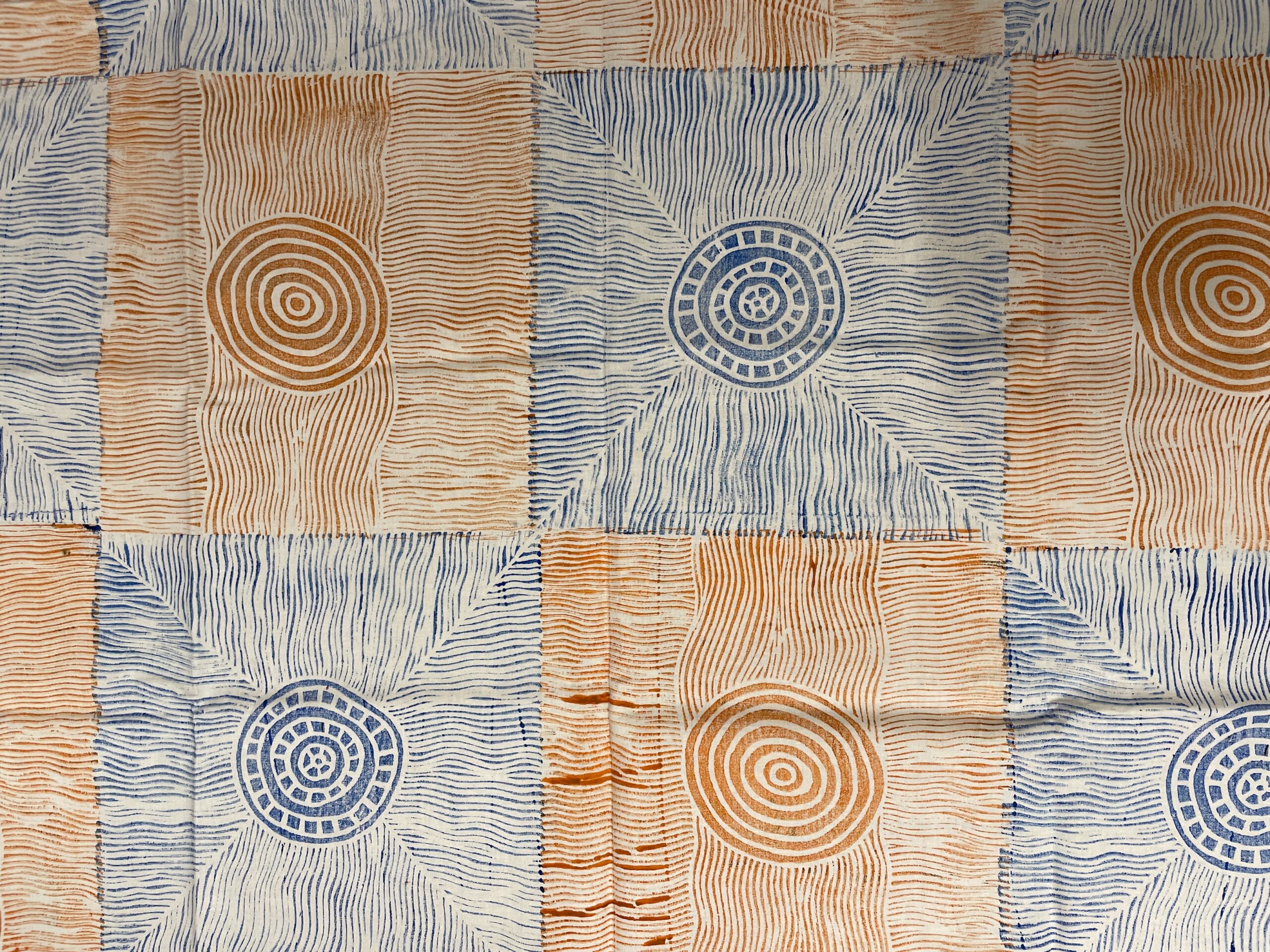 Deborah Wurrkidj is a Kuninjku artist from the Kurulk clan whose country lies around the outstation of Mumeka in central Arnhem Land. She is an accomplished artist working across mediums including painting, sculpture, weaving and textile design. For this design, Deborah Wurrkidj has depicted Marebu (woven pandanus mats).